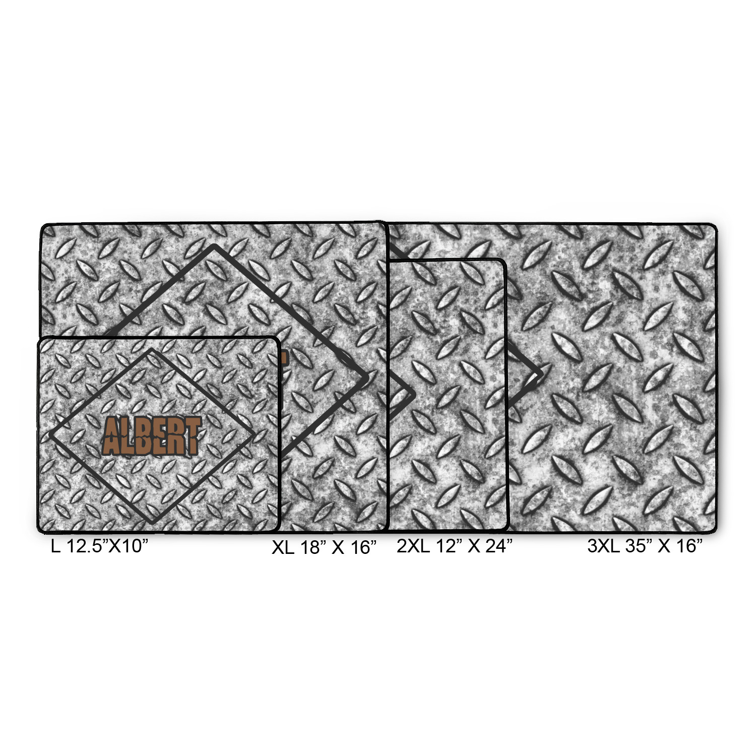 The design idea features a grungy diamond plate as the background. A diamond frame is the focal point of this design idea with your personalization in a grungy font. Nothing could get more manly than this.
