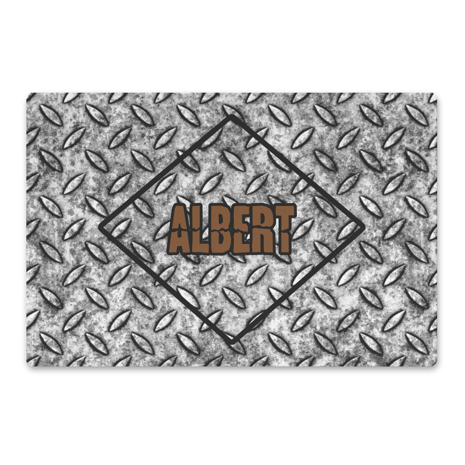 The design idea features a grungy diamond plate as the background. A diamond frame is the focal point of this design idea with your personalization in a grungy font. Nothing could get more manly than this.