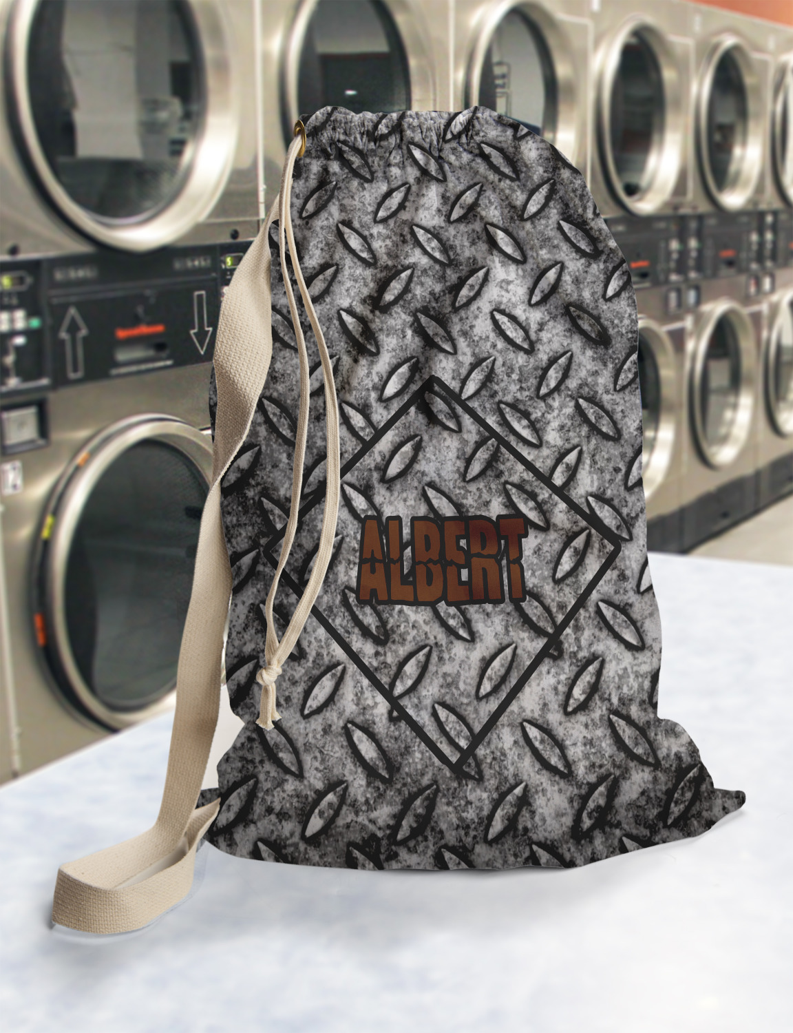 Carry your laundry in style with these customized laundry bags. Available in two sizes, featuring a natural colored woven strap and a cinch cord, these bags hold a lot of clothes or anything else you want to fit in them.