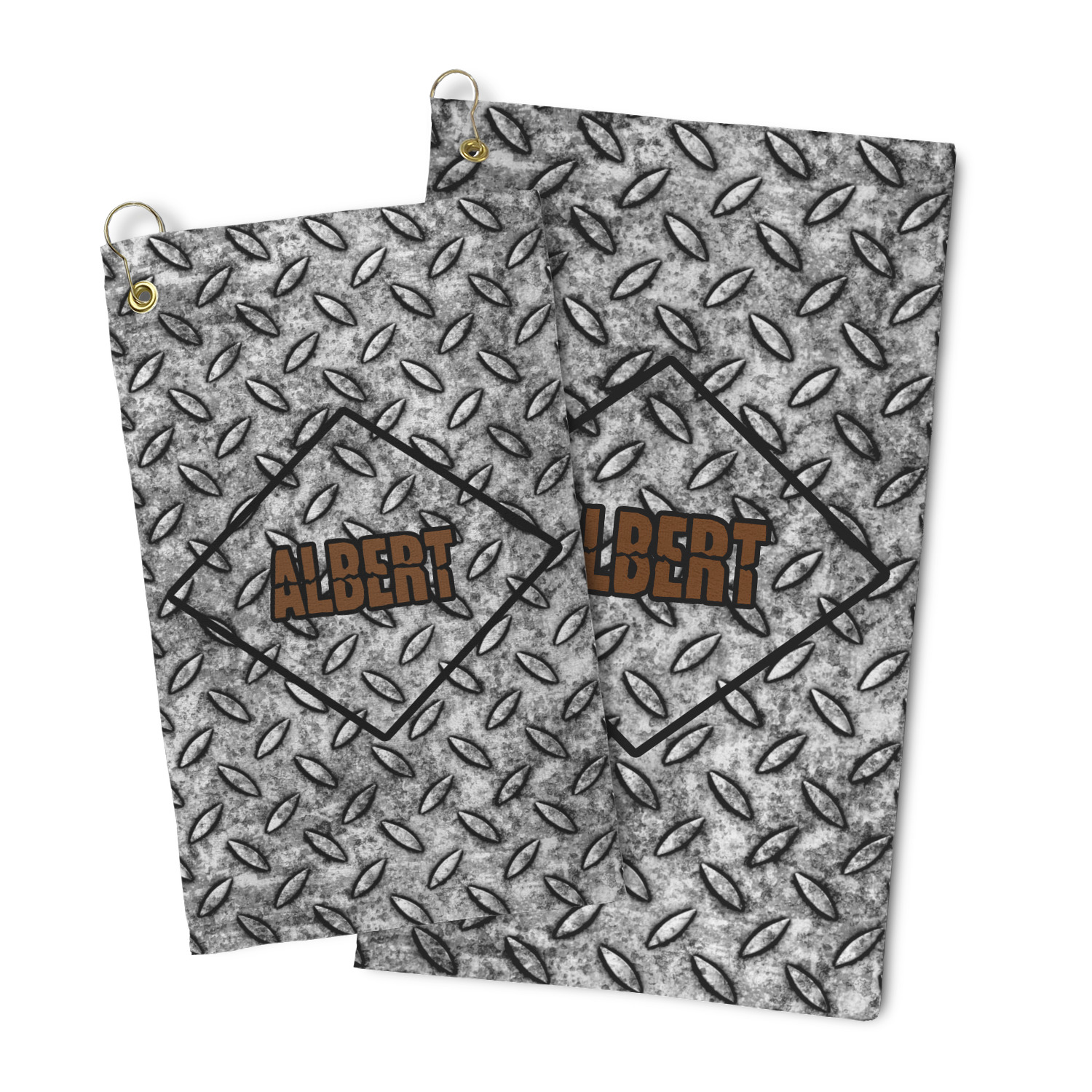 The design idea features a grungy diamond plate as the background. A diamond frame is the focal point of this design idea with your personalization in a grungy font. Nothing could get more manly than this.