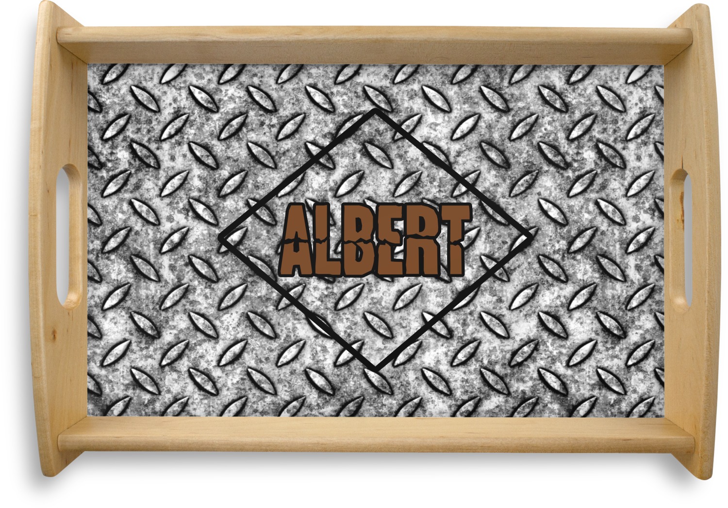 The design idea features a grungy diamond plate as the background. A diamond frame is the focal point of this design idea with your personalization in a grungy font. Nothing could get more manly than this.