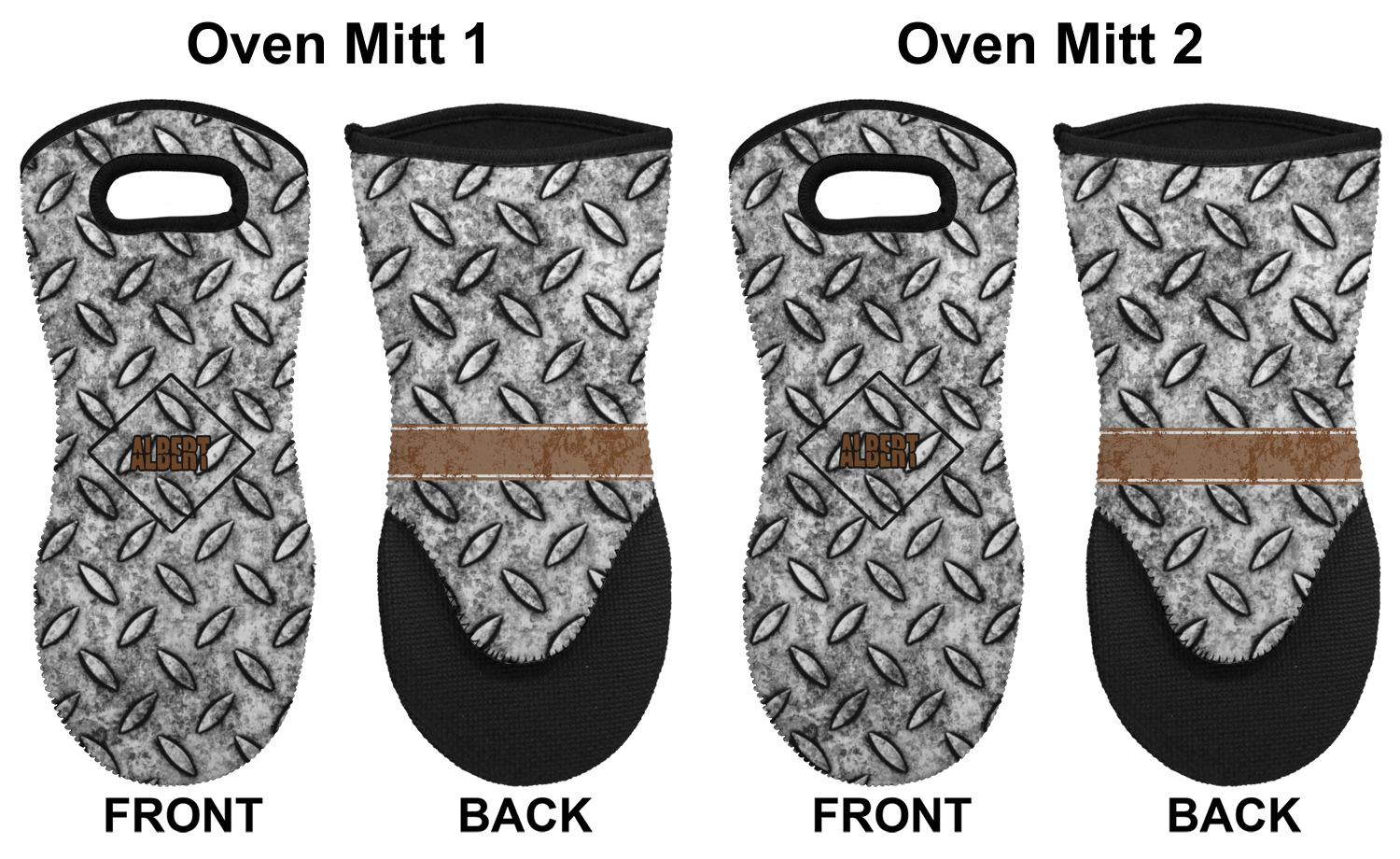These heat resistant gloves are made entirely of a durable neoprene; the front features a softer texture, while the palm's side has a textured surface, meant to handle heat up to 500 degrees Fahrenheit. Thick, heavy duty stitching connects the two sides. A small, oval cutout appears on the front, and can be used to hang and store the mitt. Your personalization appears on the front, and the upper part of the back of the mitt. The style of these oven mitts are suitable for both the right and left hand, depending on your needs. If you need one for each hand, be sure to order two!