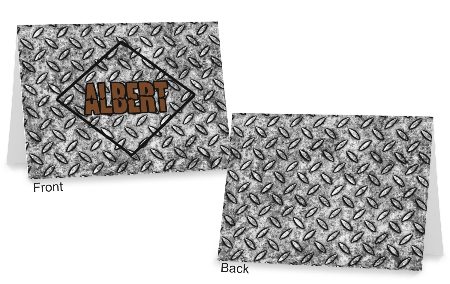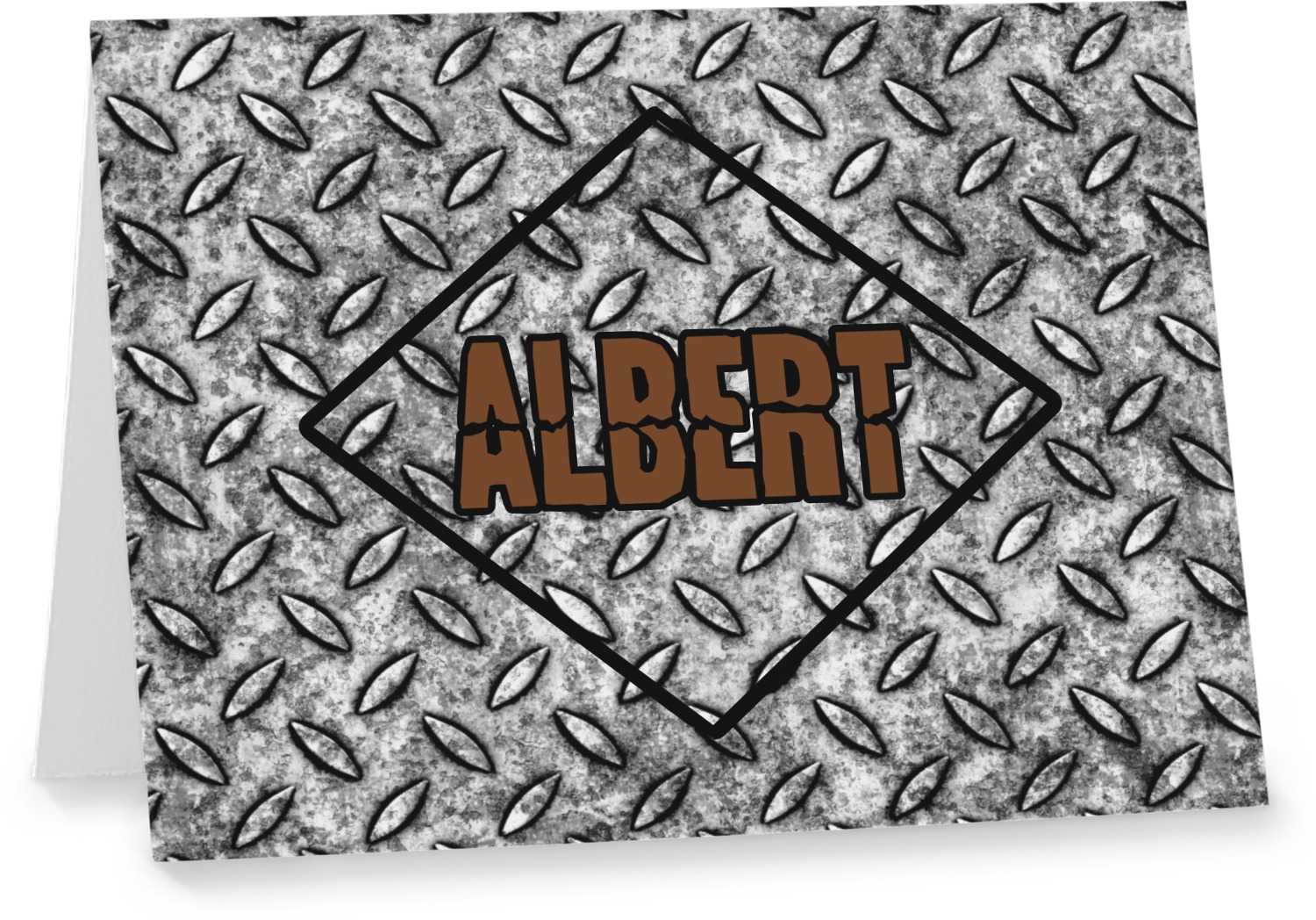 The design idea features a grungy diamond plate as the background. A diamond frame is the focal point of this design idea with your personalization in a grungy font. Nothing could get more manly than this.