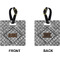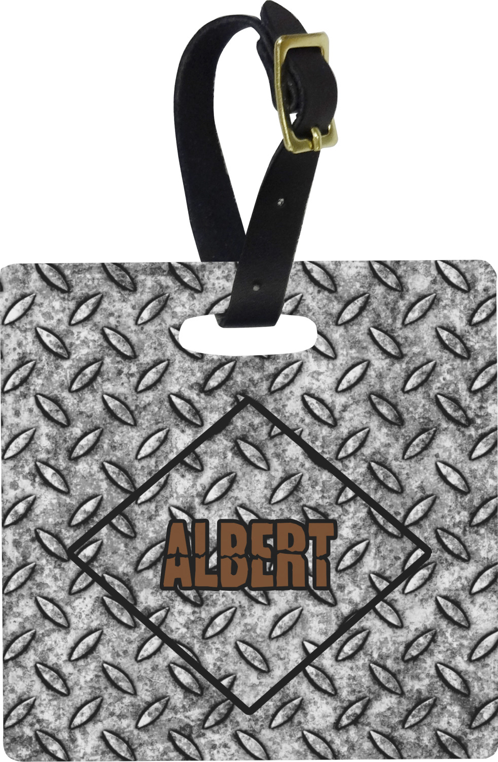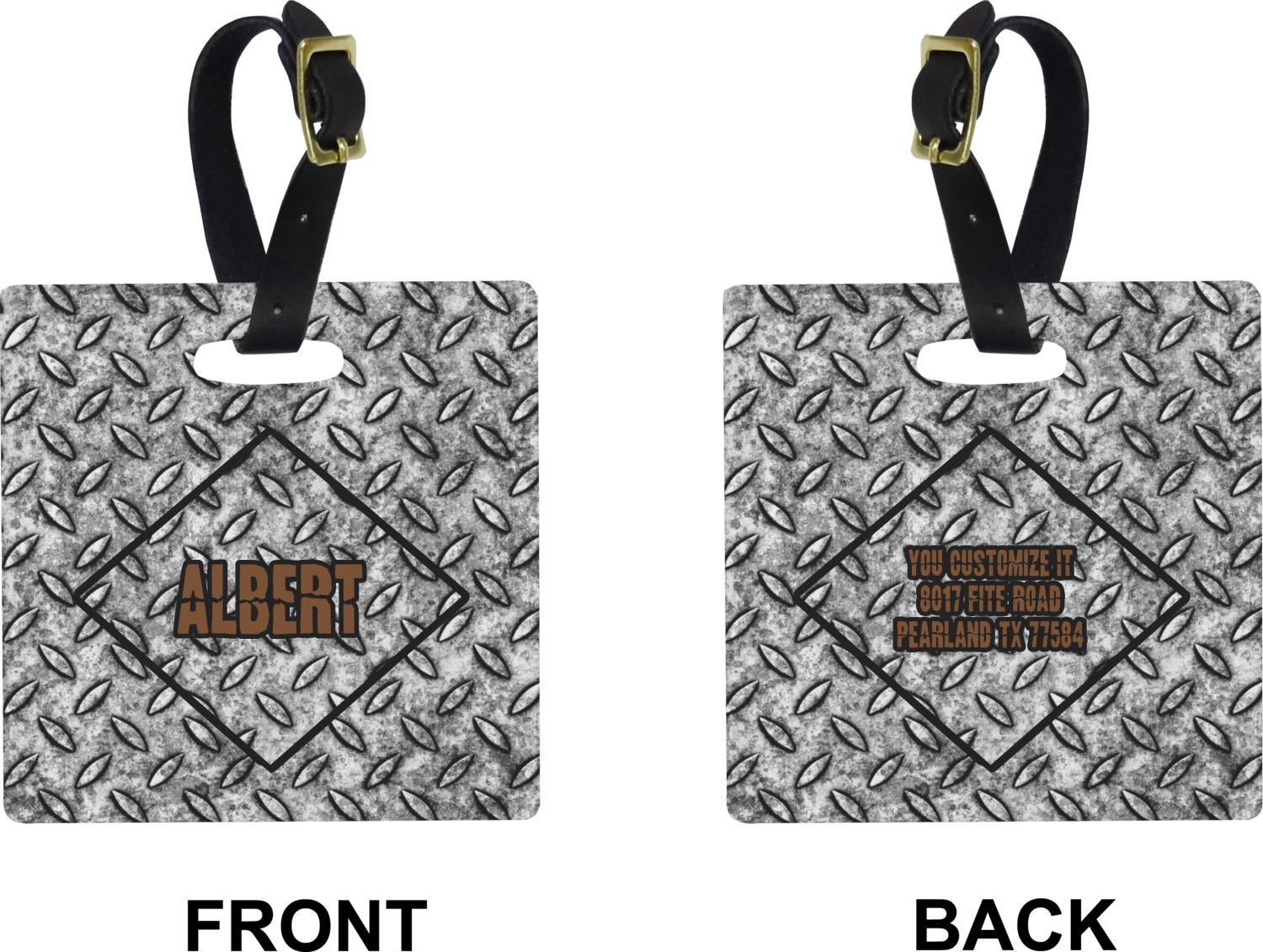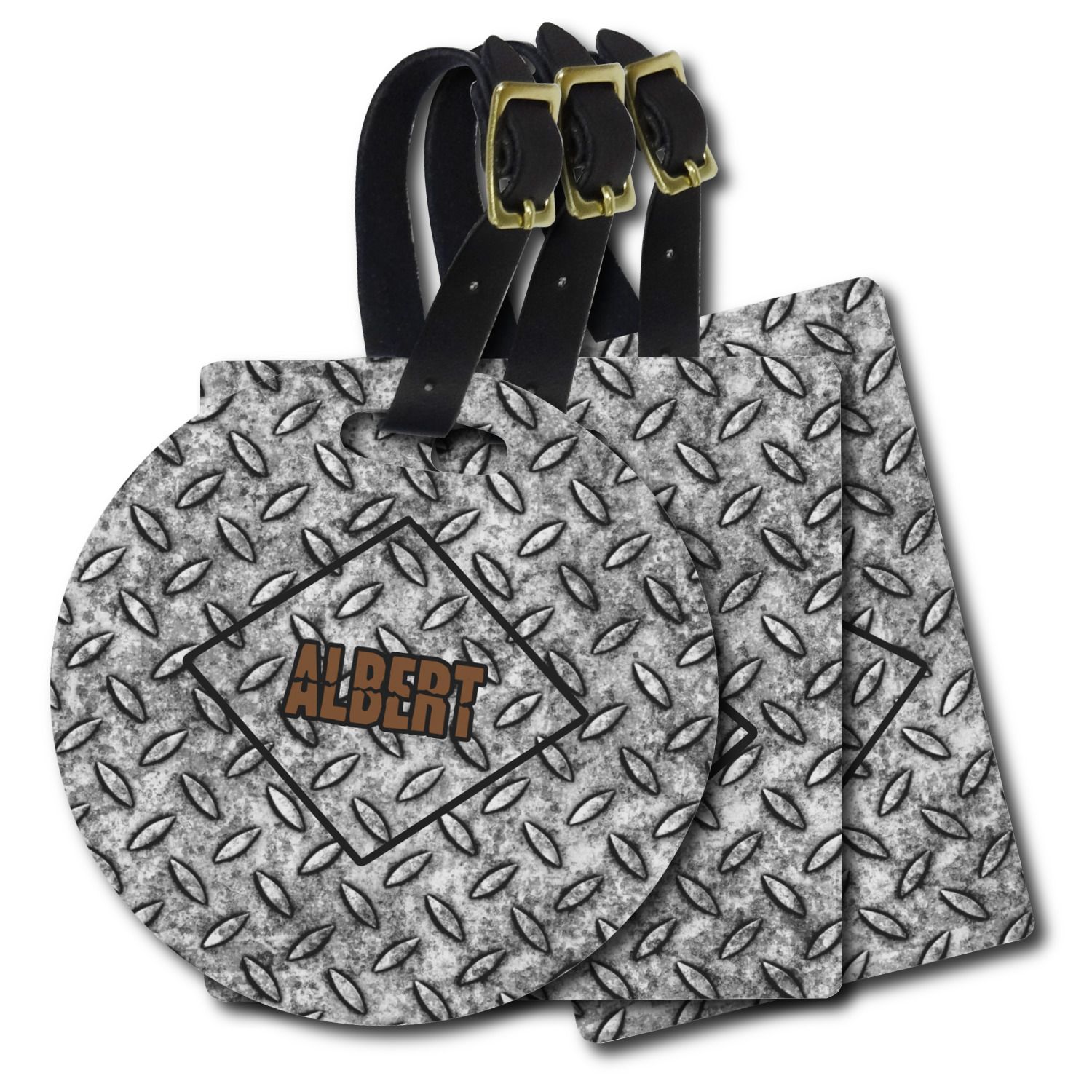 These personalized bag tags are sold in a variety of shapes, so that you may find the product that meets your vision exactly. We sell a round luggage tag, which measures at approximately 4" x 4". Our square luggage tag is about 3.5" x 3.5", while our rectangular version is 2.75" x 4 ".