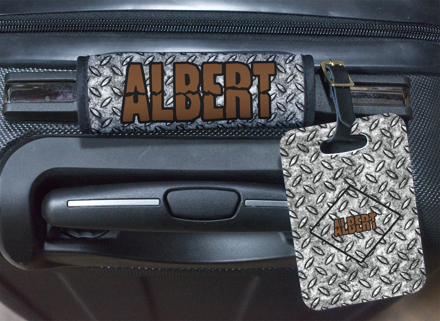 The design idea features a grungy diamond plate as the background. A diamond frame is the focal point of this design idea with your personalization in a grungy font. Nothing could get more manly than this.