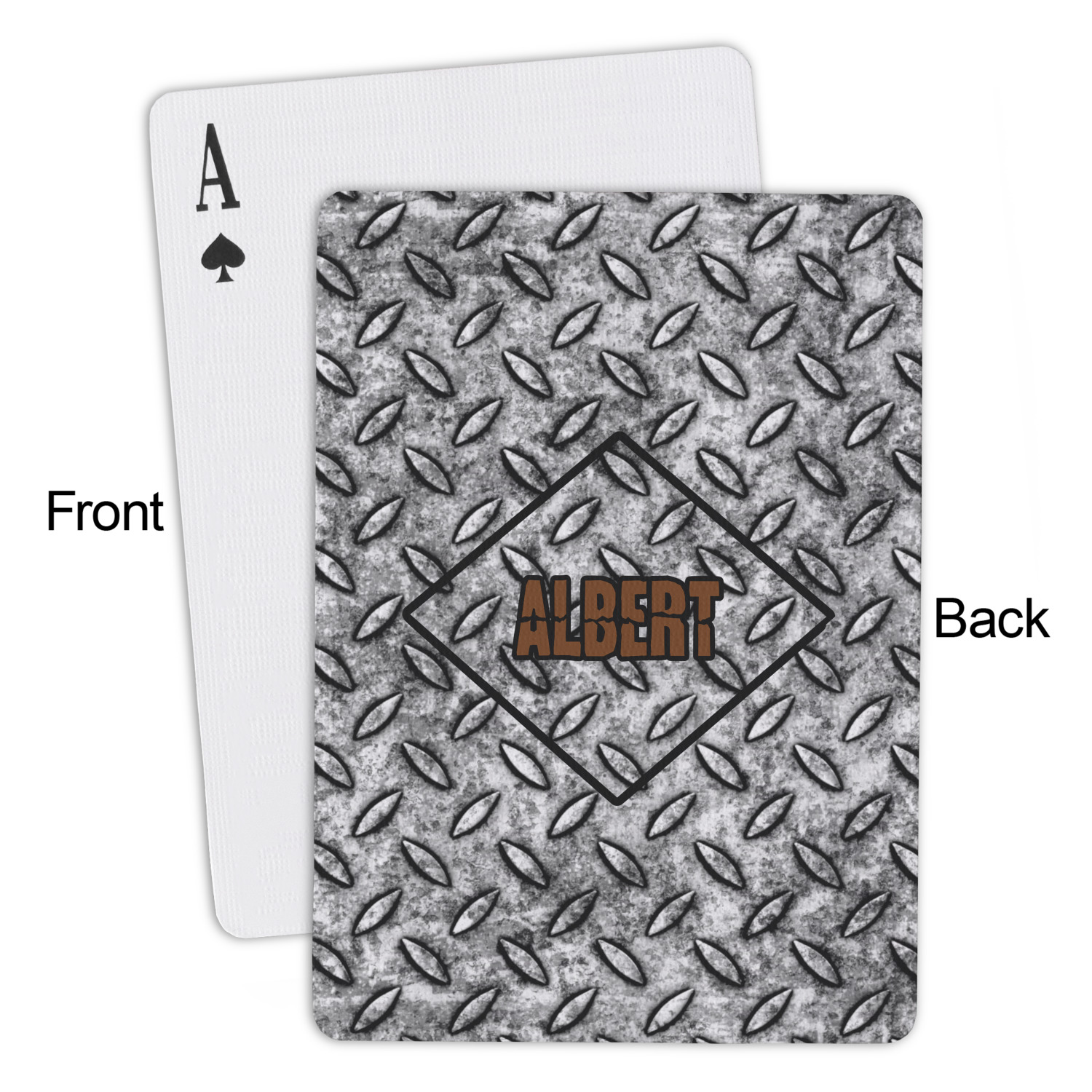 The customization / personalization is printed on the back side. The playing cards have a low gloss coating on both sides. The cards are packaged in a clear plastic box.