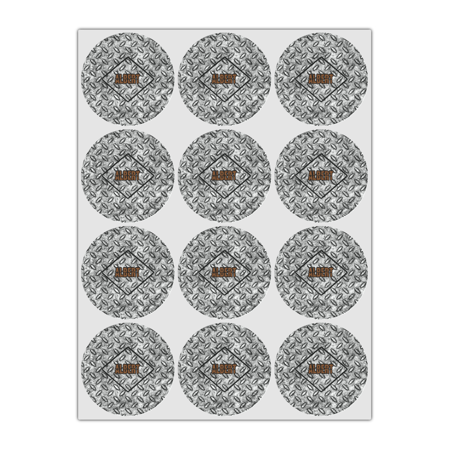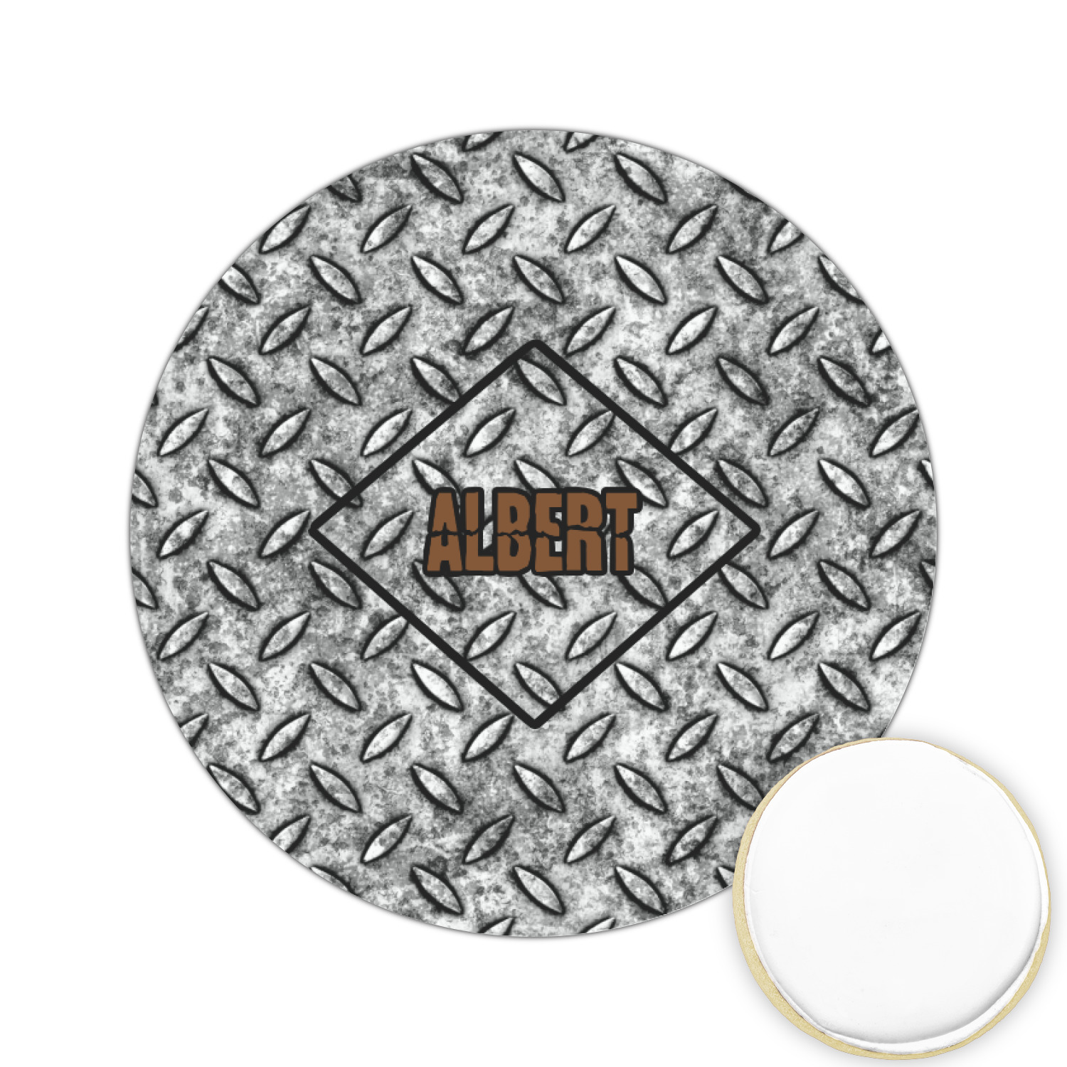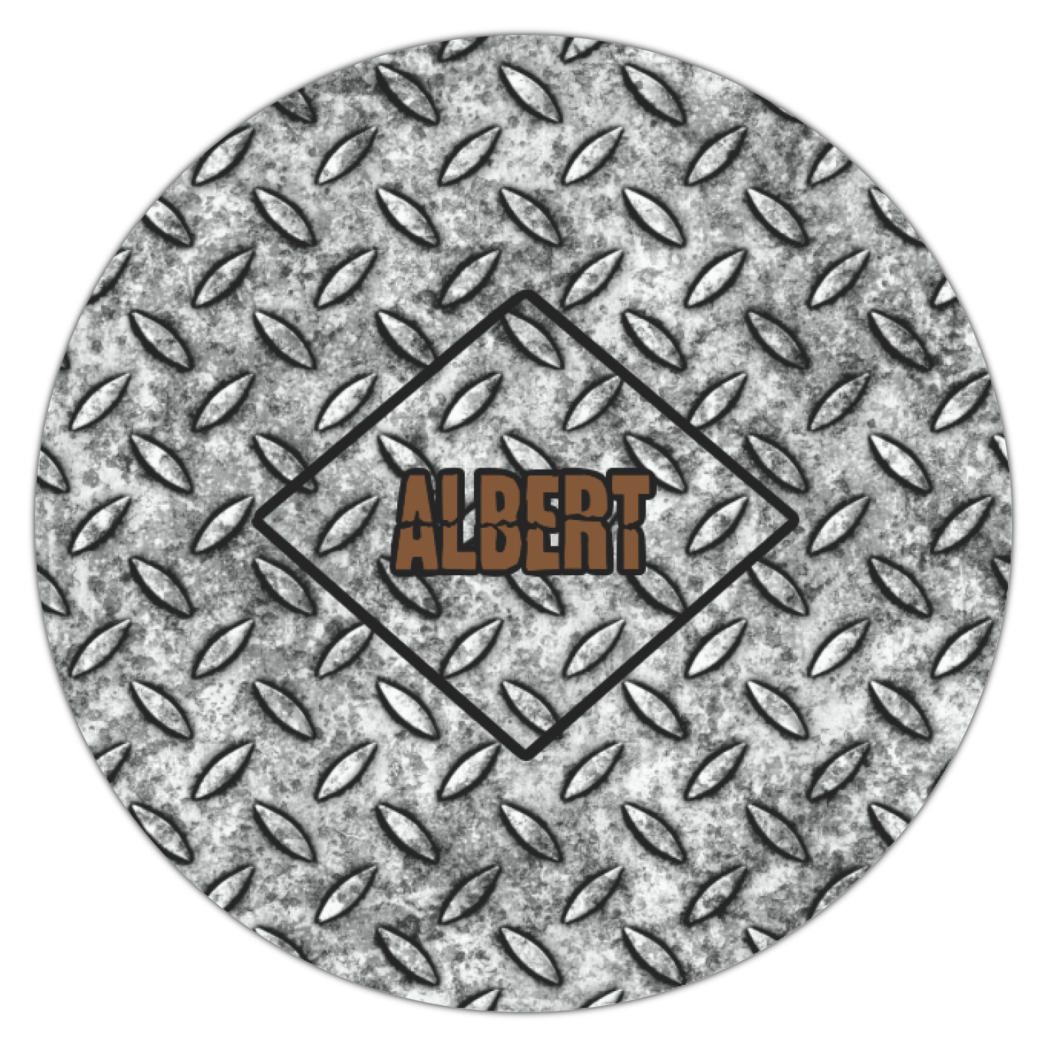 The design idea features a grungy diamond plate as the background. A diamond frame is the focal point of this design idea with your personalization in a grungy font. Nothing could get more manly than this.