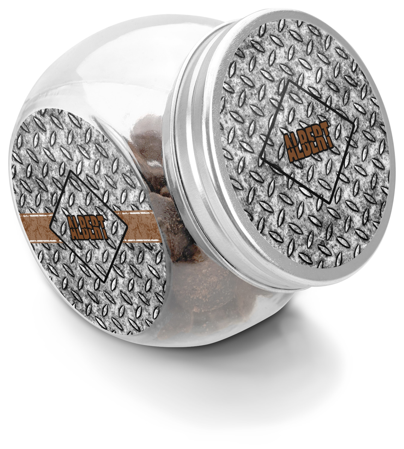This treat jar is an excellent way to store treats for your favorite canine or feline. Moreover, their delicate, classy appearance makes them a tasteful addition to your countertop's décor. Crafted from clear glass, its unique construction and silver metal, screw-on lid allows for quick and easy access. Three, permanent, vinyl stickers are applied to both sides of the jar and lid, presenting your personalized design. The base of this glass, dog treat jar is 3.4" x 4.75", and the jar stands at 5" tall. Though on the smaller side, this jar is best suited for smaller treats or training treats.