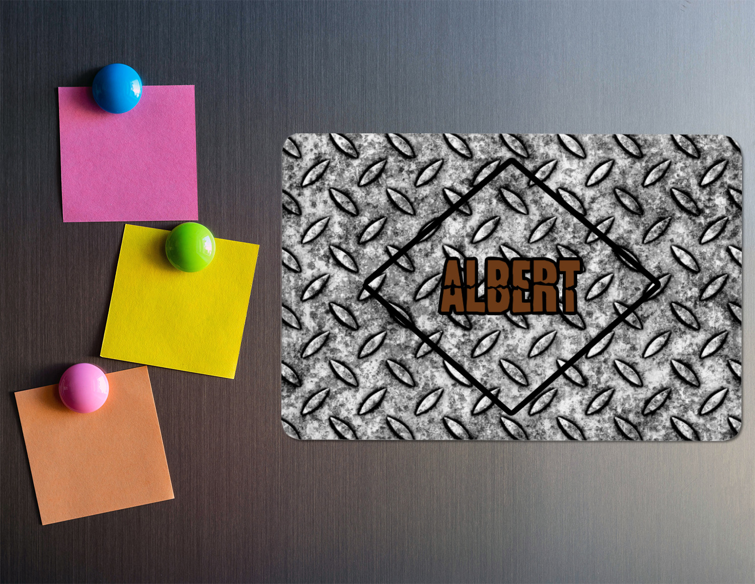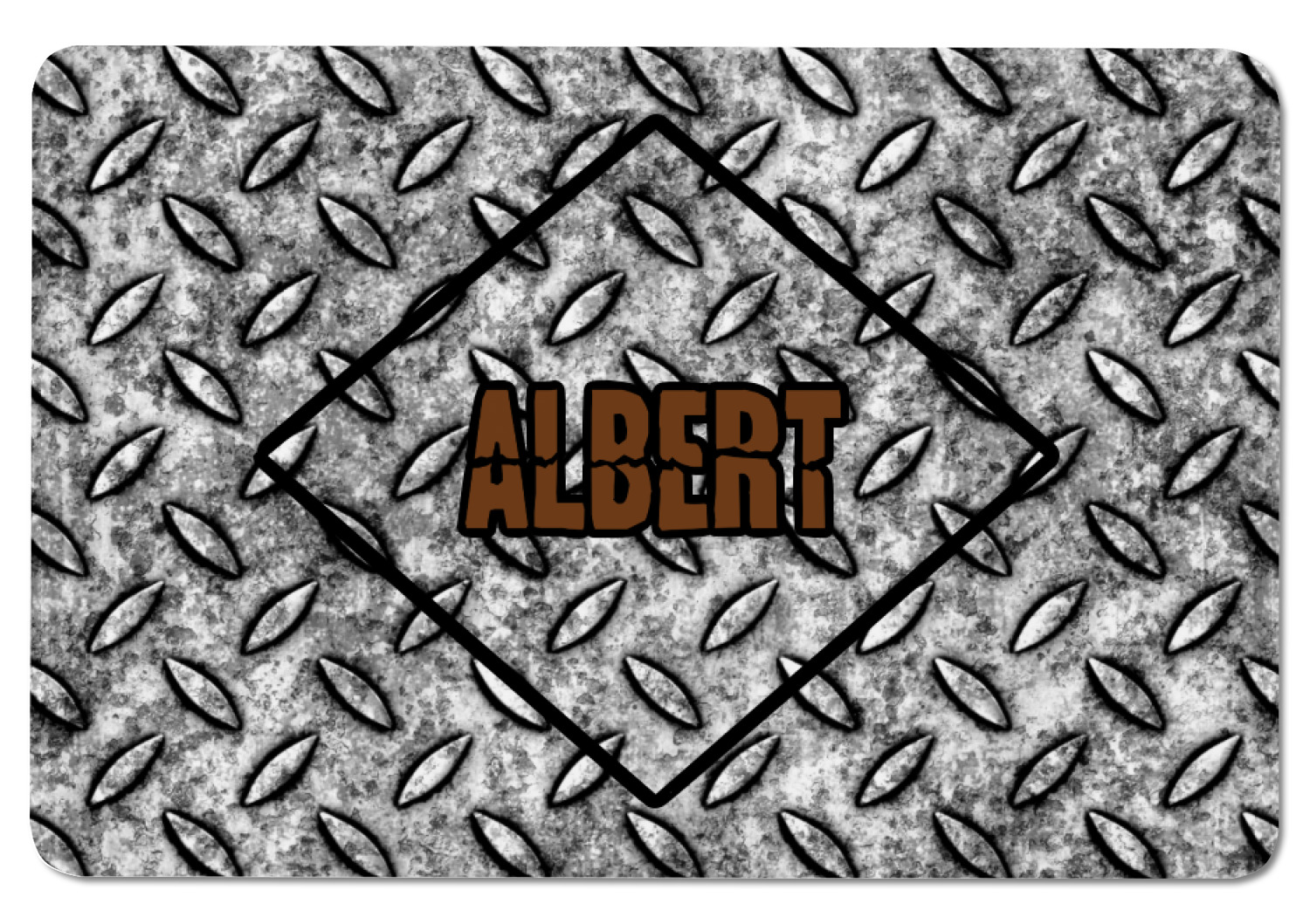 The design idea features a grungy diamond plate as the background. A diamond frame is the focal point of this design idea with your personalization in a grungy font. Nothing could get more manly than this.