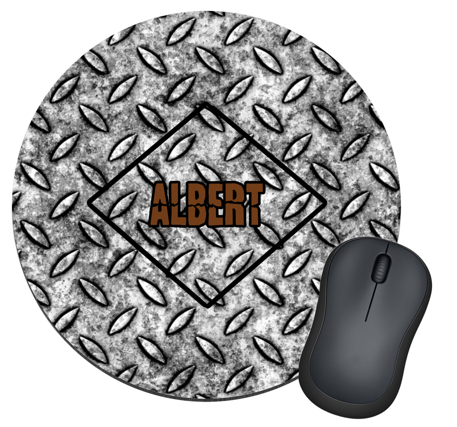 The design idea features a grungy diamond plate as the background. A diamond frame is the focal point of this design idea with your personalization in a grungy font. Nothing could get more manly than this.