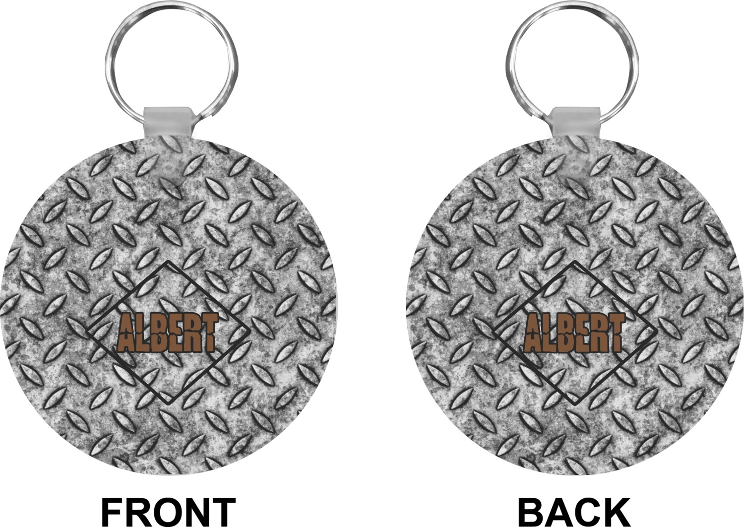 Our personalized keychains attach to the included metal, split key ring with a plastic, removable snap. Since a metal ring is included with your purchase, you have the liberty to keep your keys together on the ring, with or without your unique keychain. We offer this keychain in three different shapes: circle, heart, or diamond. We print your personalized design(s) on both sides of the key chain, and the surface has a glossy, reflective finish that only emphasizes your design. Each keychain is approximately 2.25 by 2.25 inches.