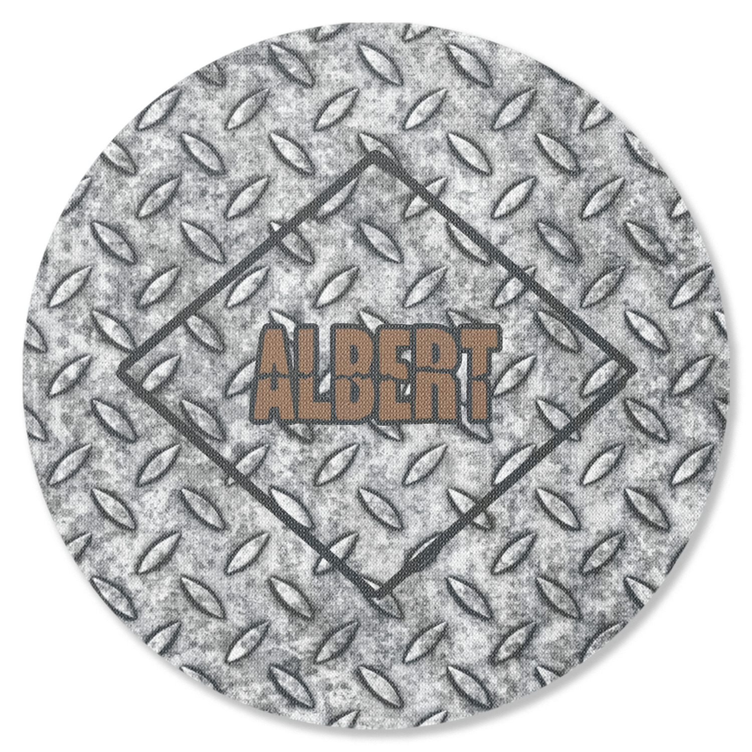 The design idea features a grungy diamond plate as the background. A diamond frame is the focal point of this design idea with your personalization in a grungy font. Nothing could get more manly than this.