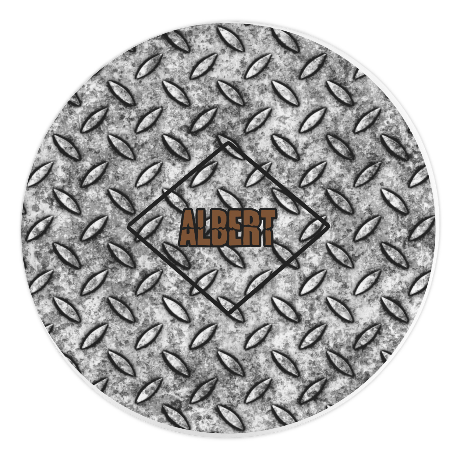 The design idea features a grungy diamond plate as the background. A diamond frame is the focal point of this design idea with your personalization in a grungy font. Nothing could get more manly than this.