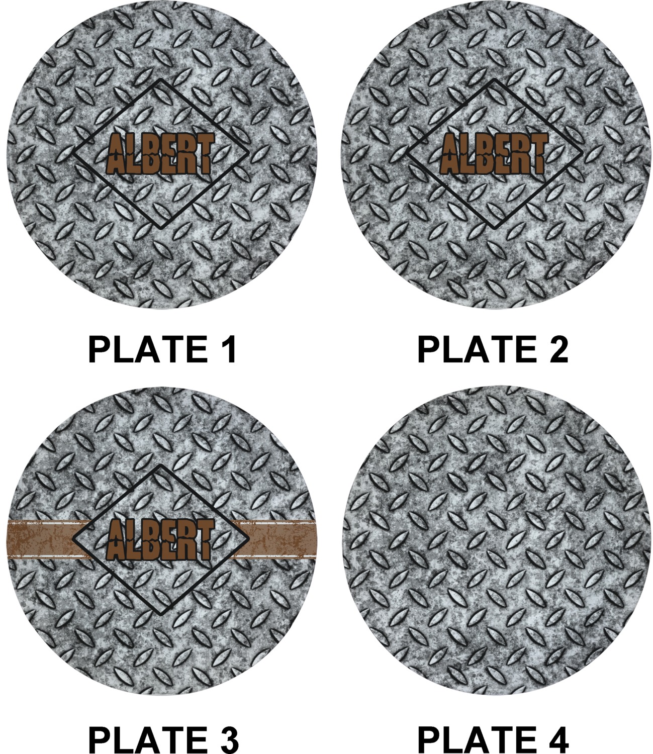 The design idea features a grungy diamond plate as the background. A diamond frame is the focal point of this design idea with your personalization in a grungy font. Nothing could get more manly than this.