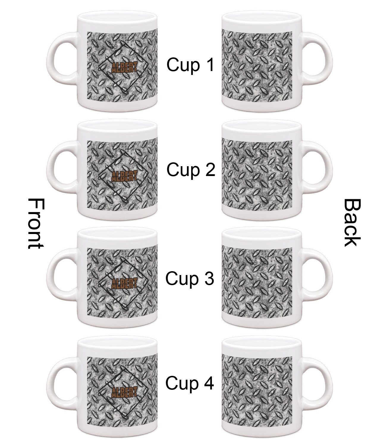 Each of our espresso mugs is a ceramic material sure to keep your drink warm. Personalize one cup for yourself, or order a set of 4! Its the perfect little gift for any coffee lover! We carry two sizes for you to personalize - 3 oz. (approx. 3.25" x 2.325" x 2.625") or 6 oz. (approx. 4" x 2.9" x 2.9"). Our 3 oz. mug is perfect for that single shot espresso while our 6 oz. mug can be your next favorite cappuccino cup holding two shots of espresso!