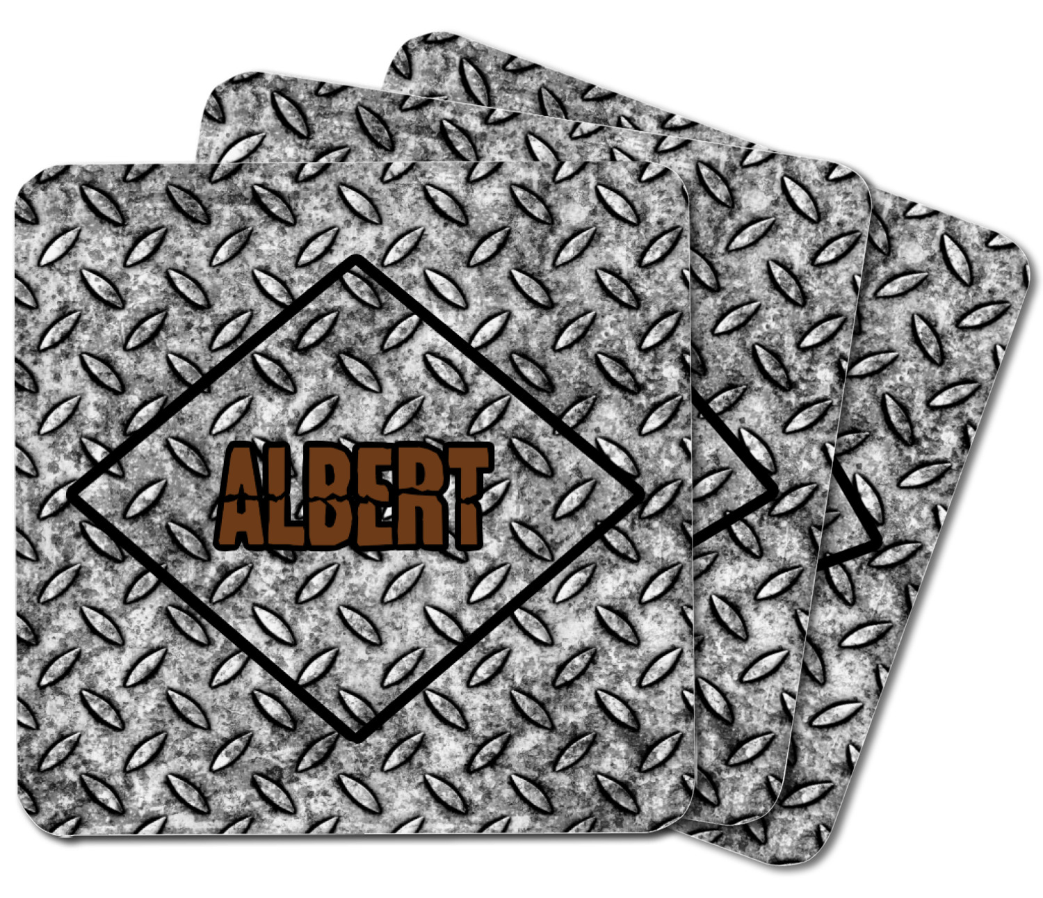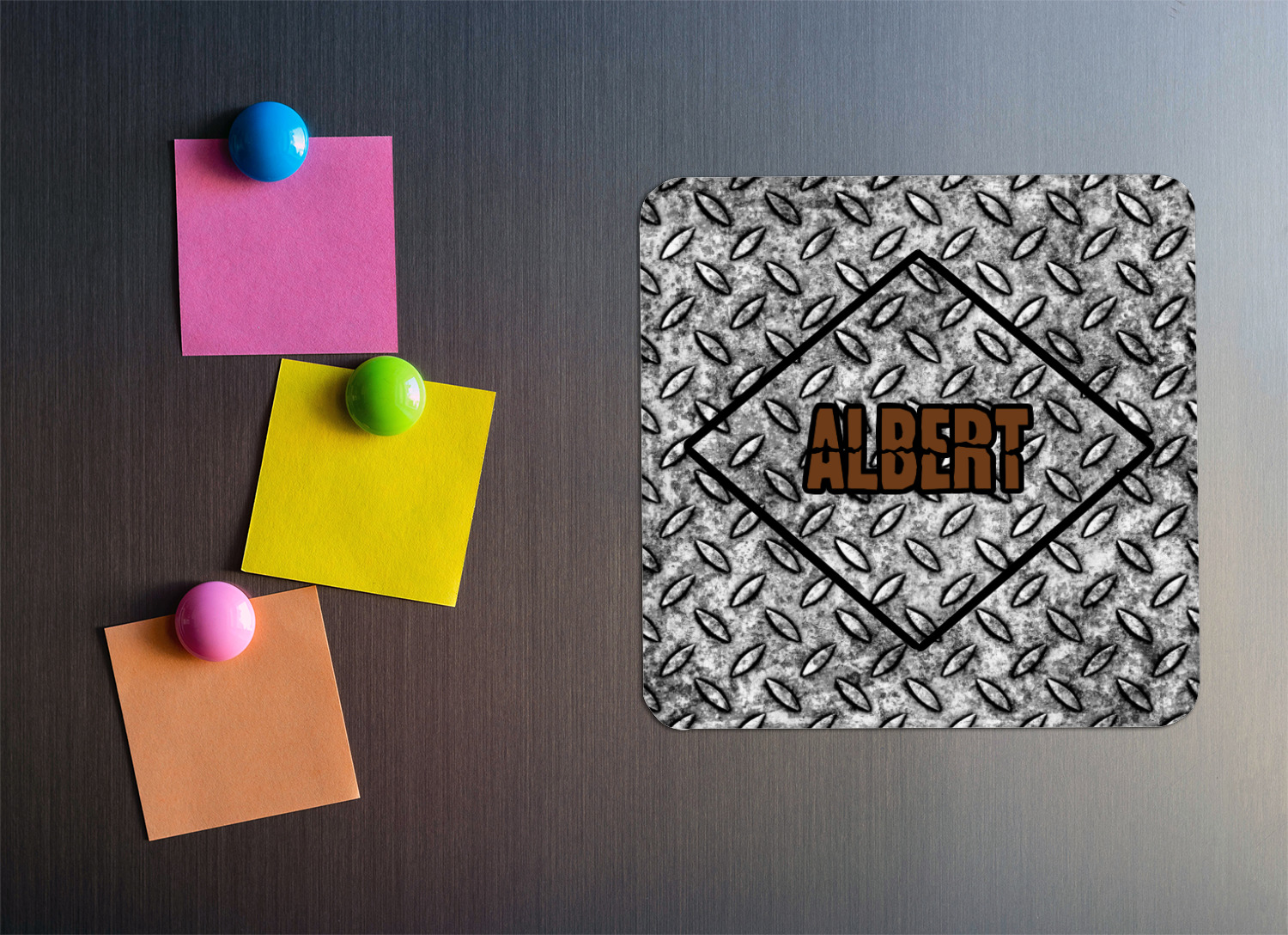 The design idea features a grungy diamond plate as the background. A diamond frame is the focal point of this design idea with your personalization in a grungy font. Nothing could get more manly than this.