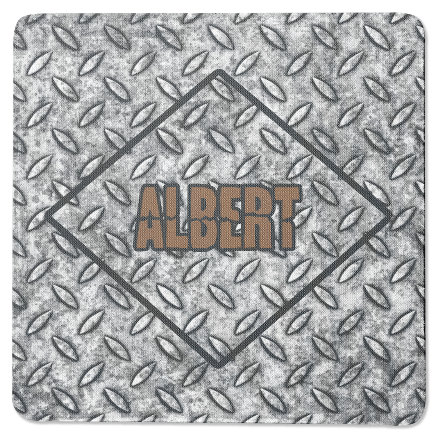 The design idea features a grungy diamond plate as the background. A diamond frame is the focal point of this design idea with your personalization in a grungy font. Nothing could get more manly than this.