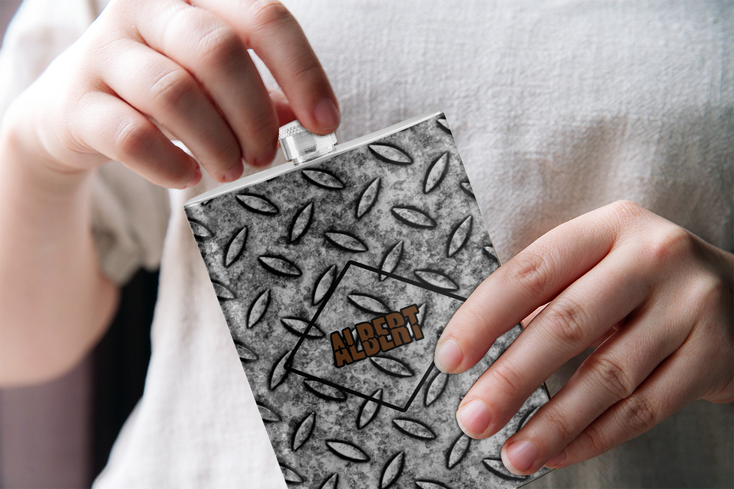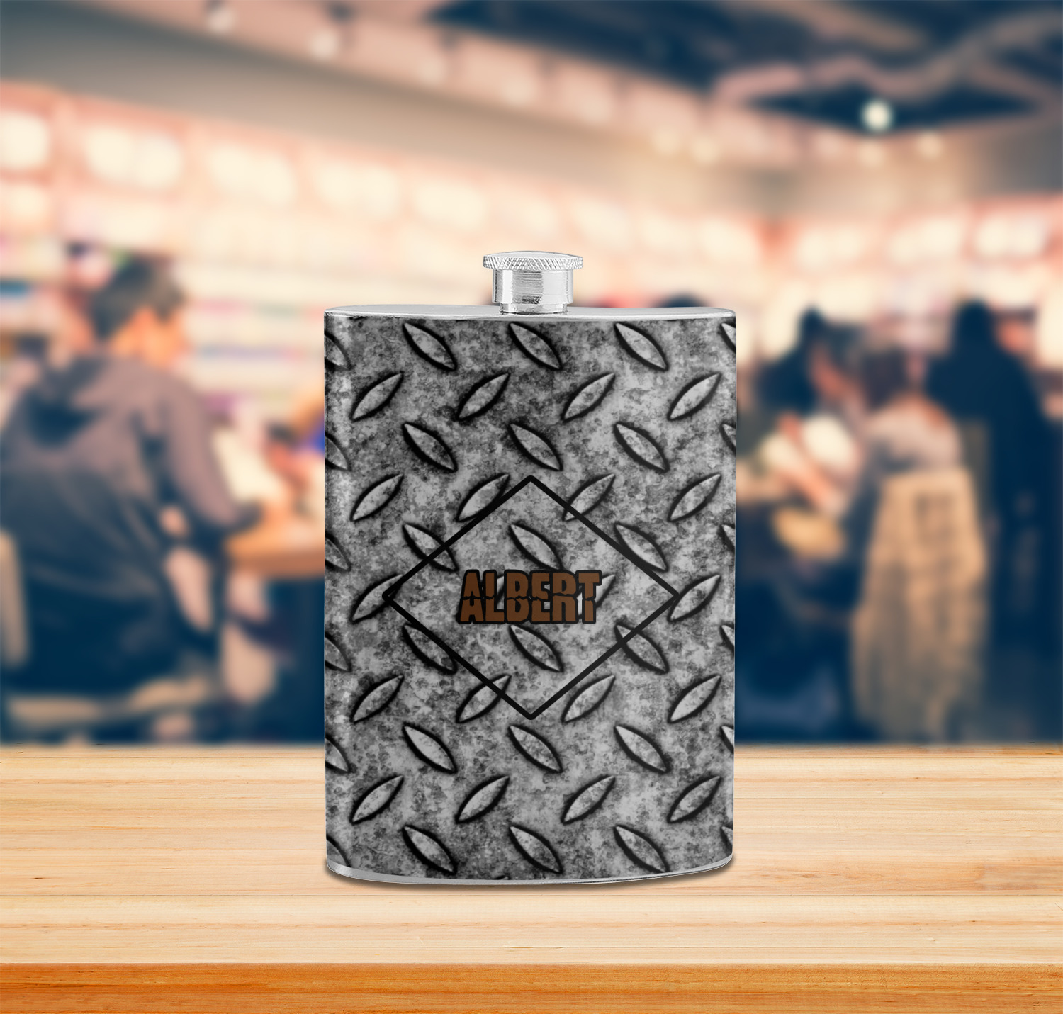 The design idea features a grungy diamond plate as the background. A diamond frame is the focal point of this design idea with your personalization in a grungy font. Nothing could get more manly than this.