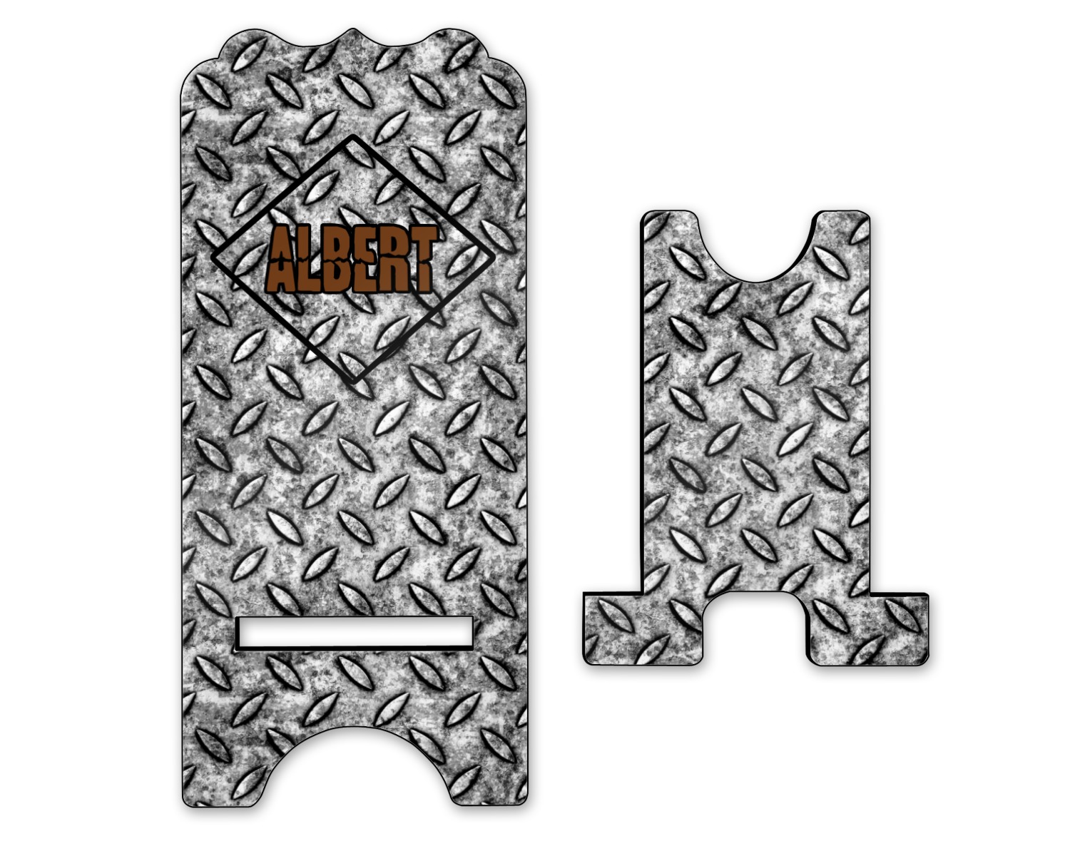 The design idea features a grungy diamond plate as the background. A diamond frame is the focal point of this design idea with your personalization in a grungy font. Nothing could get more manly than this.