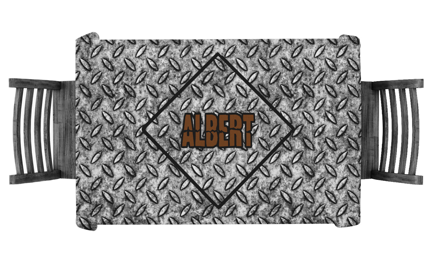 The design idea features a grungy diamond plate as the background. A diamond frame is the focal point of this design idea with your personalization in a grungy font. Nothing could get more manly than this.