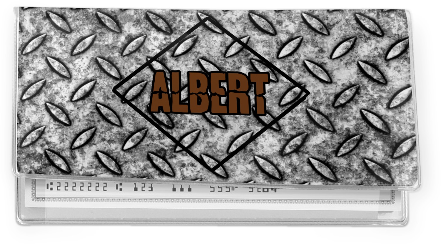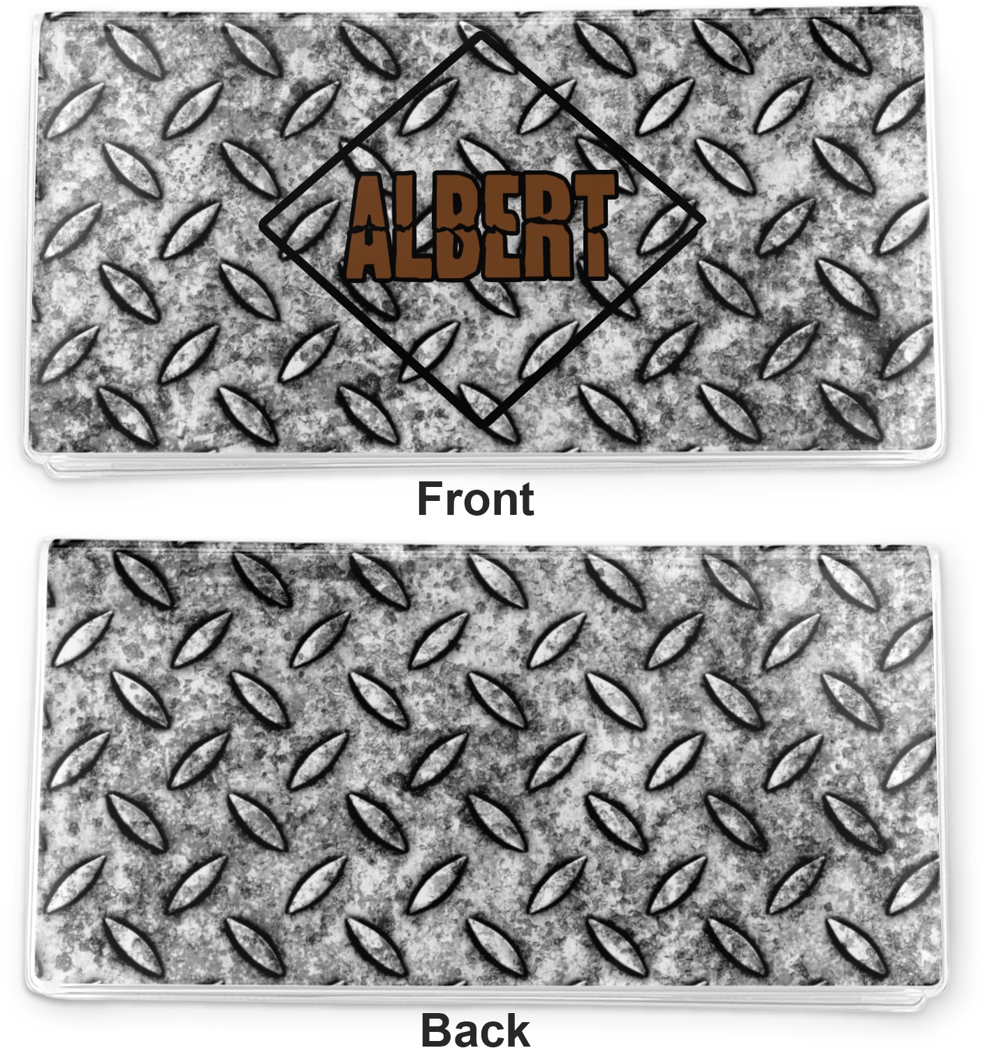 The design idea features a grungy diamond plate as the background. A diamond frame is the focal point of this design idea with your personalization in a grungy font. Nothing could get more manly than this.