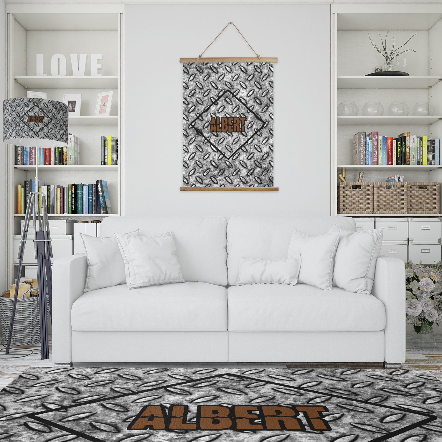 The design idea features a grungy diamond plate as the background. A diamond frame is the focal point of this design idea with your personalization in a grungy font. Nothing could get more manly than this.