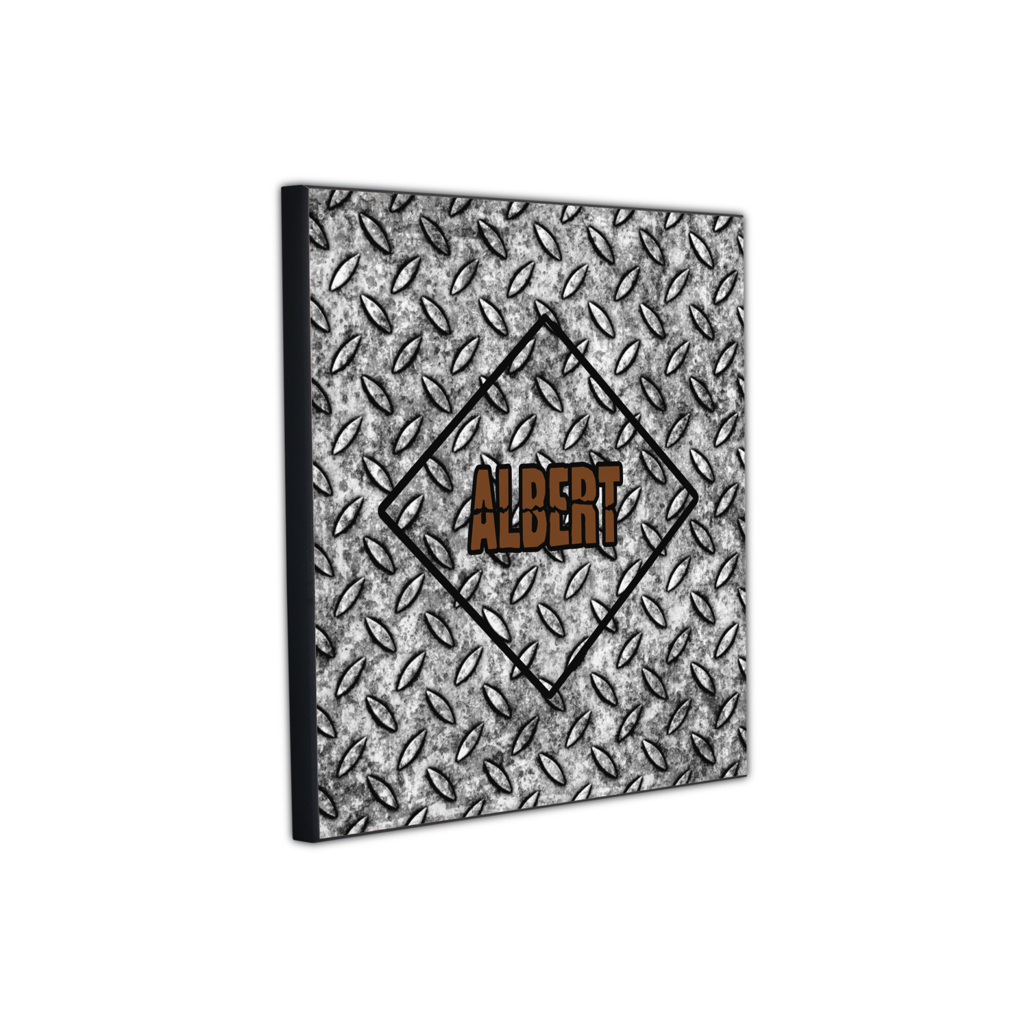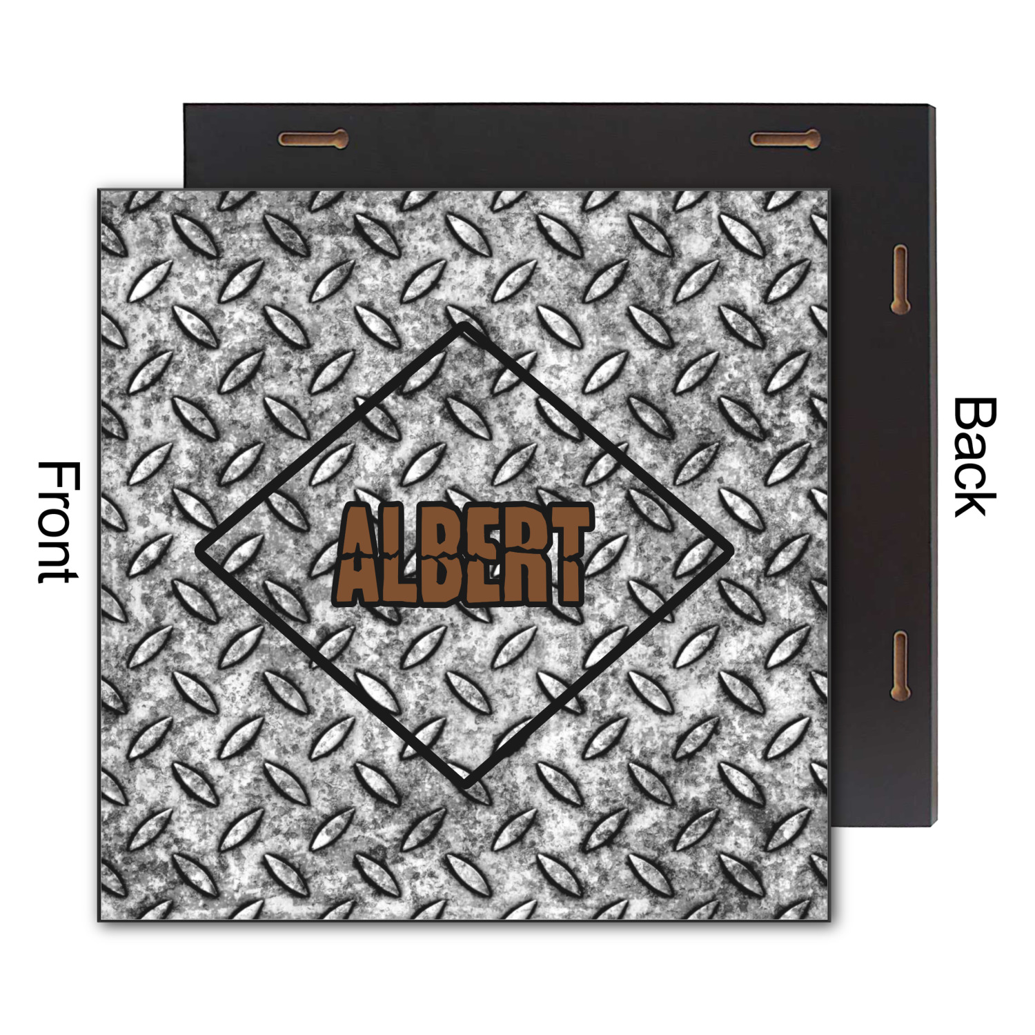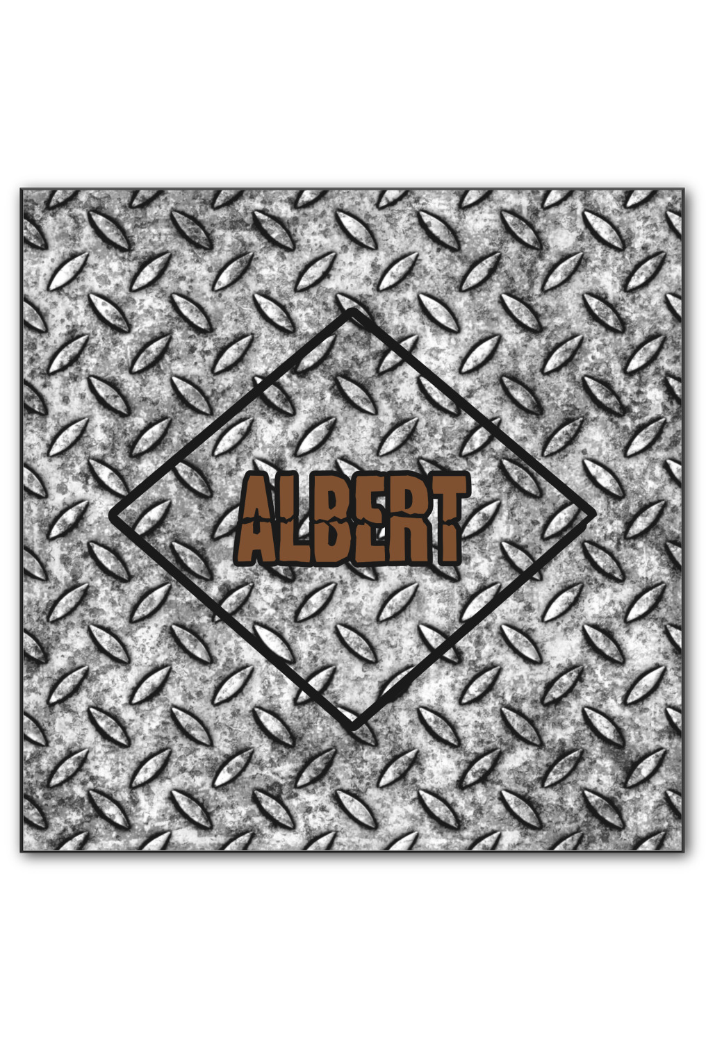 The design idea features a grungy diamond plate as the background. A diamond frame is the focal point of this design idea with your personalization in a grungy font. Nothing could get more manly than this.