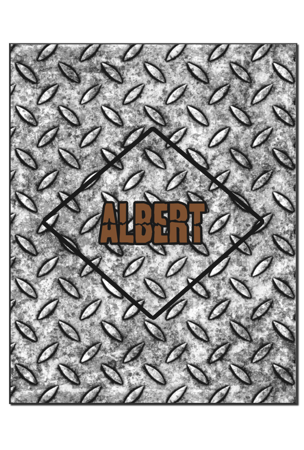 The design idea features a grungy diamond plate as the background. A diamond frame is the focal point of this design idea with your personalization in a grungy font. Nothing could get more manly than this.