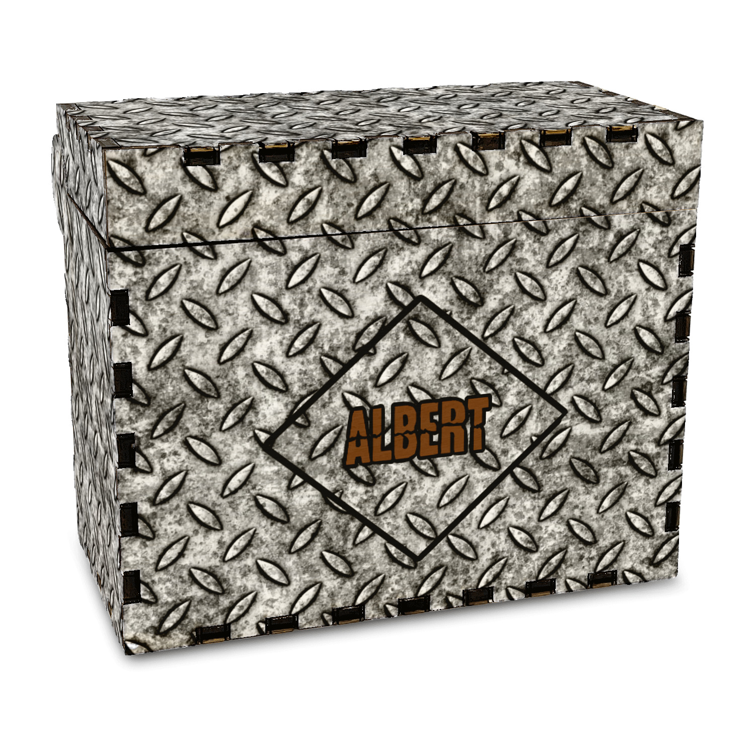 The design idea features a grungy diamond plate as the background. A diamond frame is the focal point of this design idea with your personalization in a grungy font. Nothing could get more manly than this.