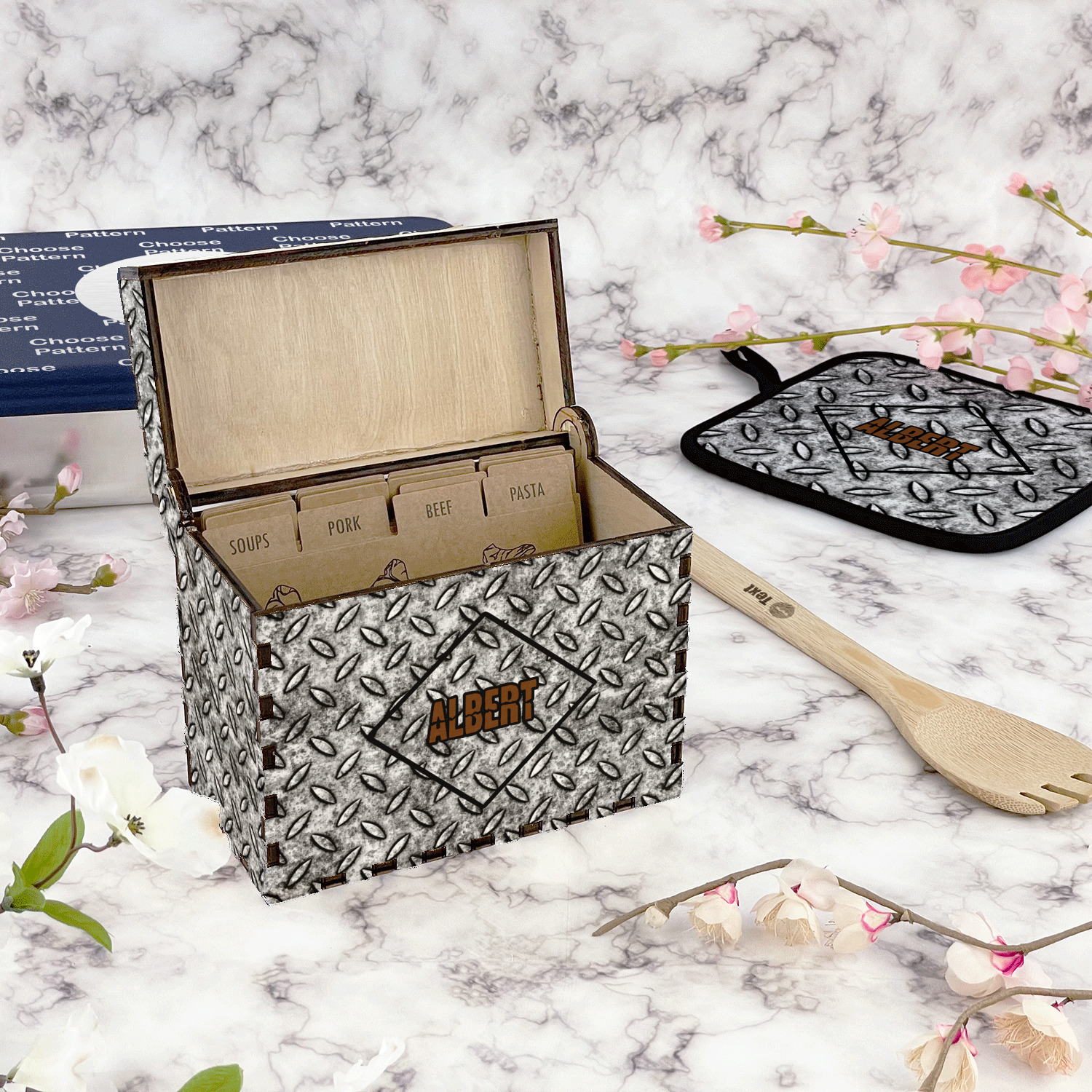 Using our design library you can design your recipe box to be personalized just for you. We will then laser engrave it and assemble it and have it ready for you to insert your recipe cards when you recieve it.