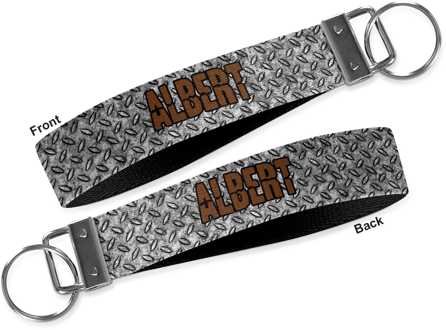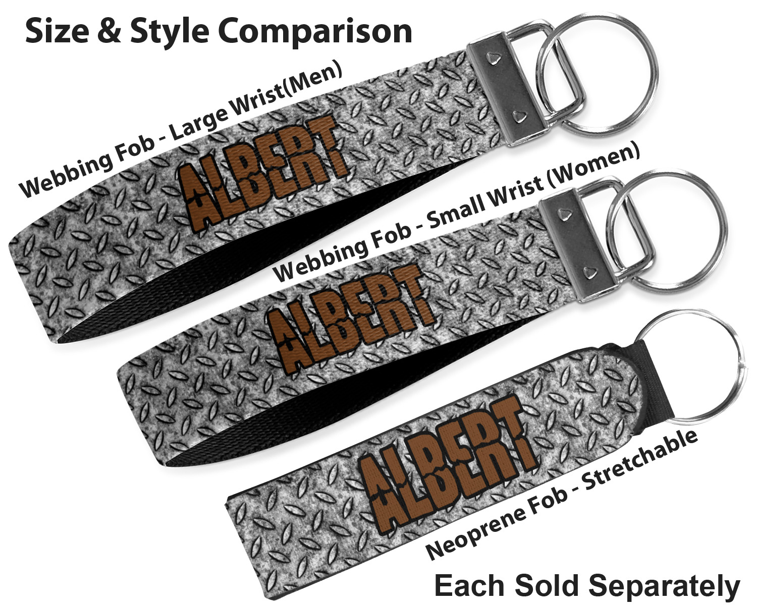 These key fob keychains are made from a polyester weave, right here in the USA. They feature a silver, metal clasp, attached to a round keyring. The piece gives the personalized wristlet a beautiful, finished look. Your customized design is printed on the outside of the keychain strap. We carry these wristlets in two sizes: small, which is 5 inches in width, and large, which is 5.5 inches in width.