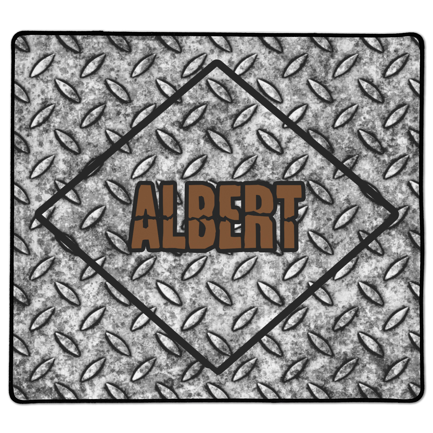 The design idea features a grungy diamond plate as the background. A diamond frame is the focal point of this design idea with your personalization in a grungy font. Nothing could get more manly than this.