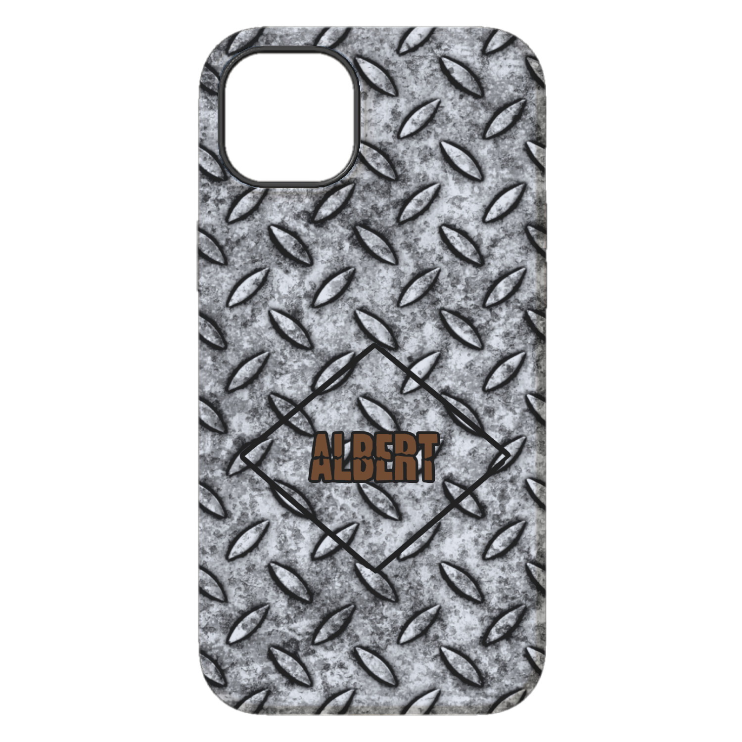 The design idea features a grungy diamond plate as the background. A diamond frame is the focal point of this design idea with your personalization in a grungy font. Nothing could get more manly than this.
