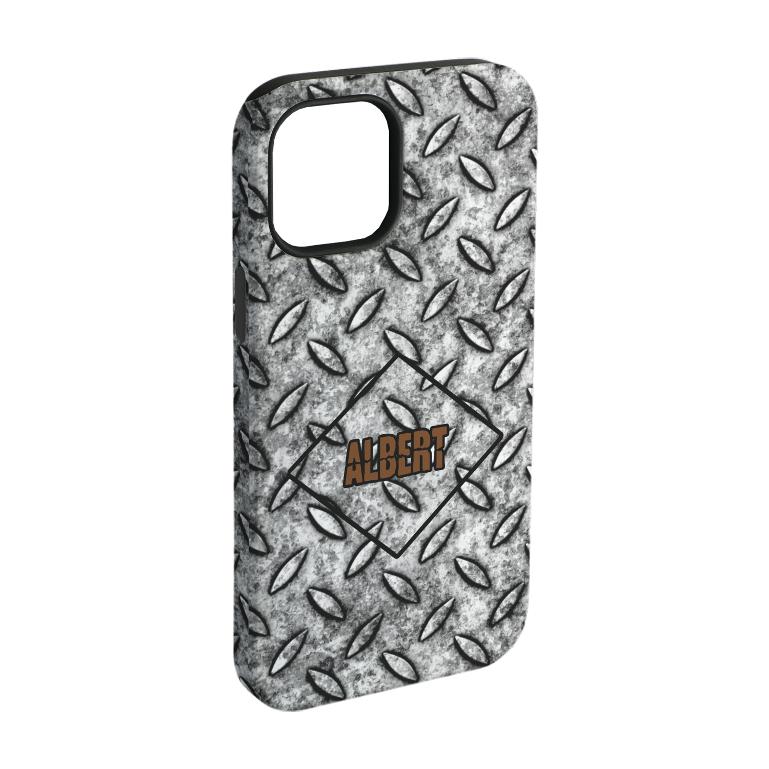The design idea features a grungy diamond plate as the background. A diamond frame is the focal point of this design idea with your personalization in a grungy font. Nothing could get more manly than this.