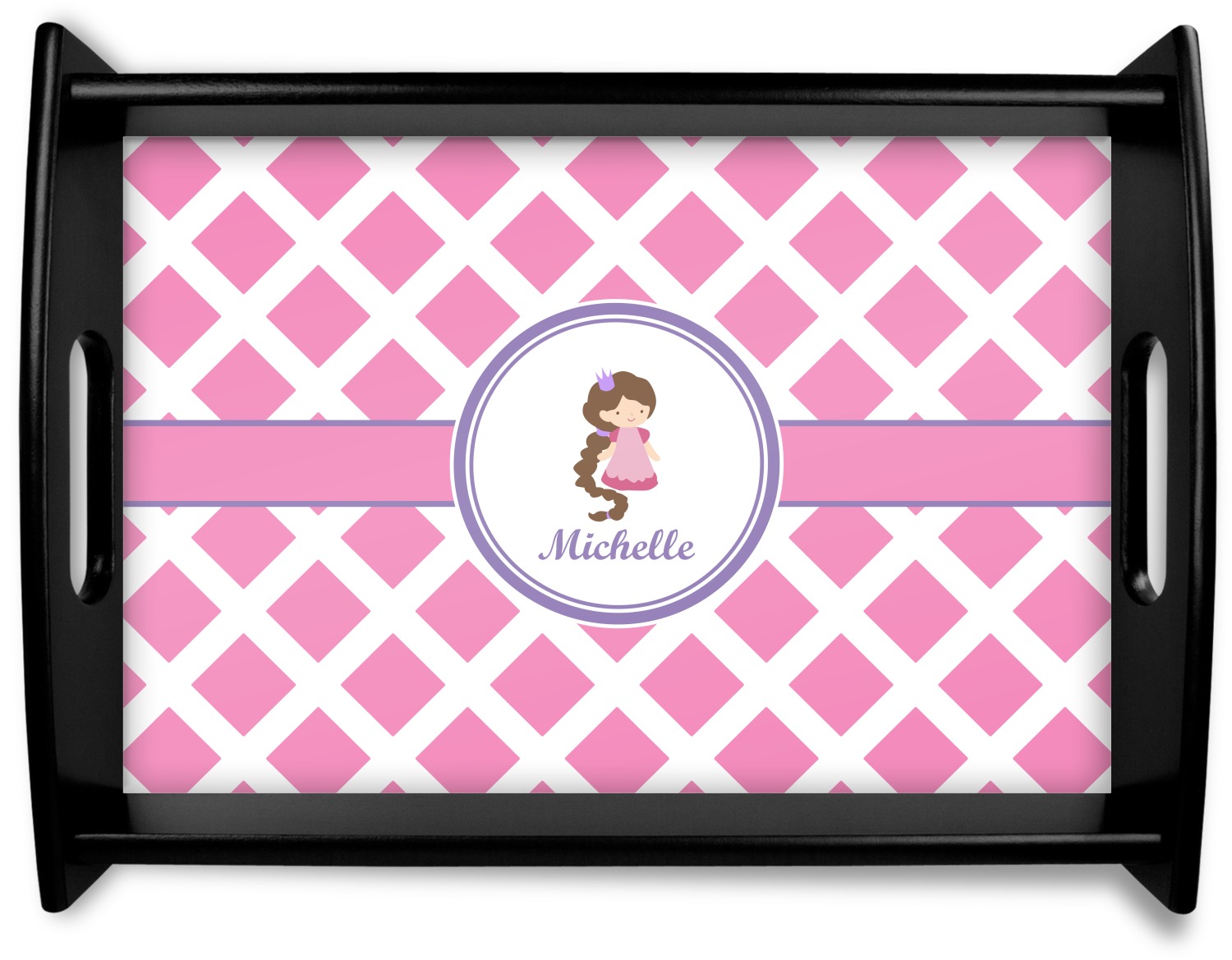 This serving tray with handles features square edges and two rounded sides, creating a very modern look. Each side is fabricated from a beautifully cut, natural wood. The bottom of the interior of the tray displays your customized design in bright, vibrant color. The tray is sold in both a black color and a natural wood look. Each variation of the wood serving tray has two sizes: Small, which is 14" x 10" x 2.25", and Large, which is 19.5" x 13.5" x 2.75".
