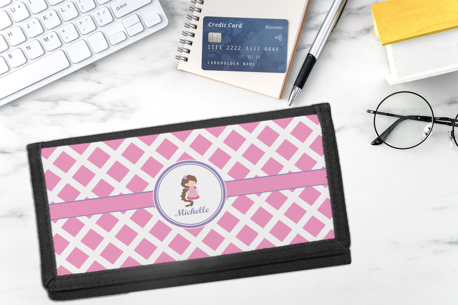 The checkbook cover is made of a durable canvas and the front flap is decorated with a vibrant design of your choosing. With 4 slots for credit cards or IDs, and 2 compartments for your checkbook register, cash, receipts, business cards, and more; this checkbook cover could easily double as a wallet.