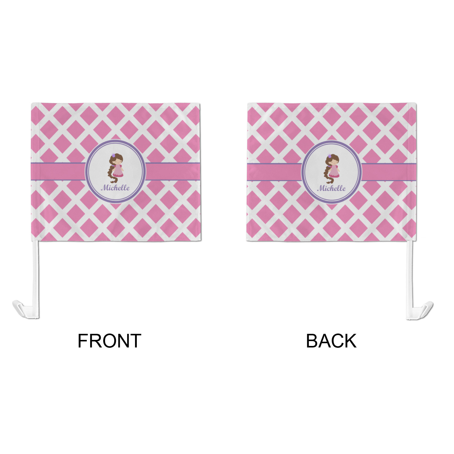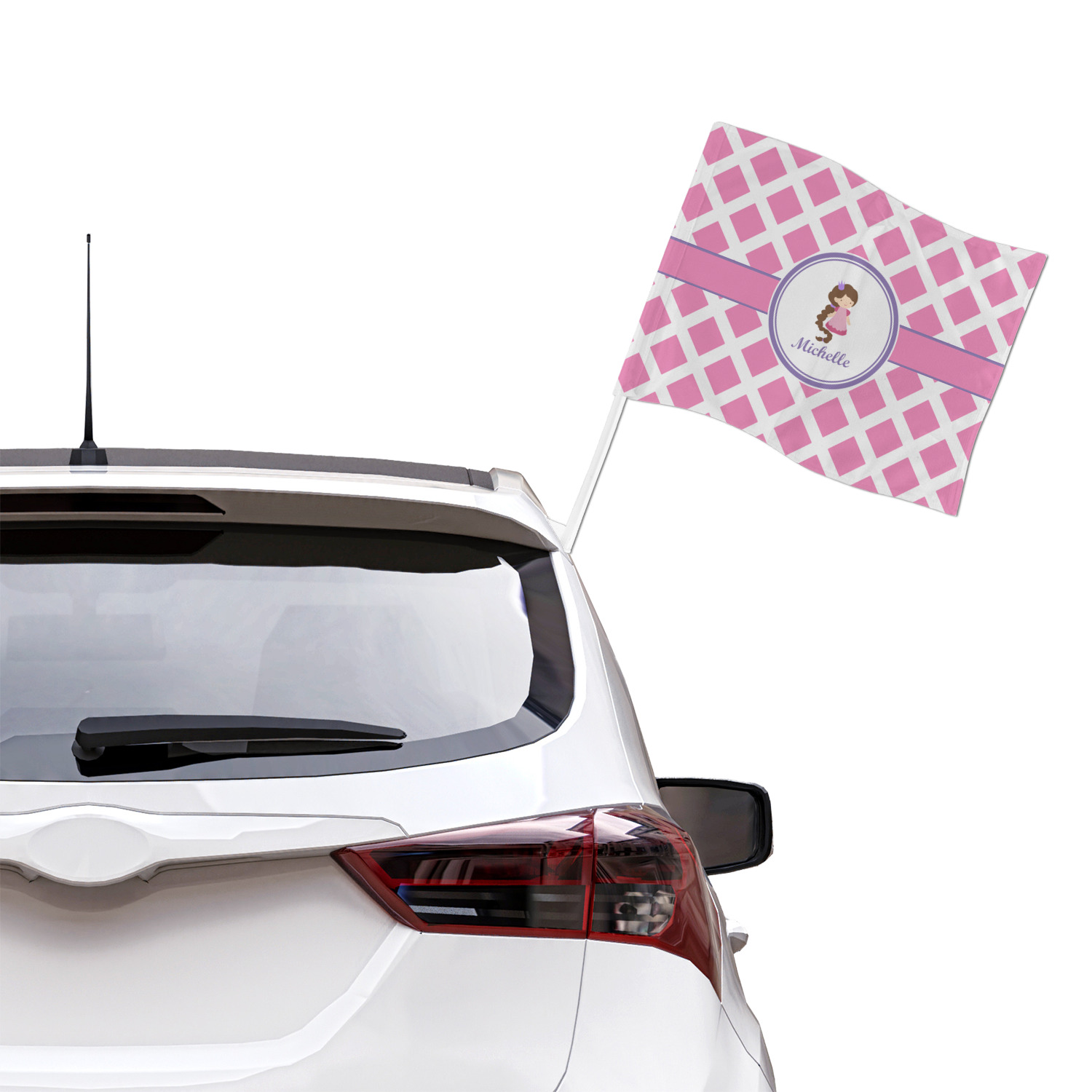 Our personalized flags are made from a durable, yet lightweight cloth that will proudly bear your logo or design of choice, while withstanding the outside elements. We have two size options - 8" x 11" and 11" x 15". Both come with a flag pole which includes a clip that secures the pole to the side window, whether it is rolled up or down. The flags are printed on both sides to display your design from all directions.