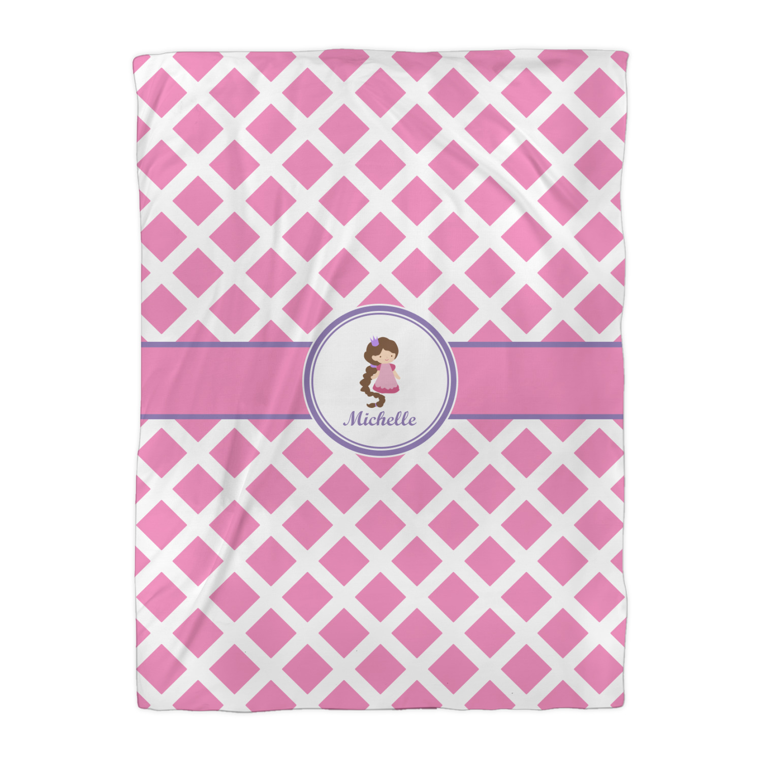This princess themed print full of little girl pink and purple makes the statement that your little girl is The Princess. This print features every princess's dream full of castles, crowns, her very own prince frog to kiss, and lots of hearts fluttering about. The bottom of the design is a coordinating pink and white diamond pattern.