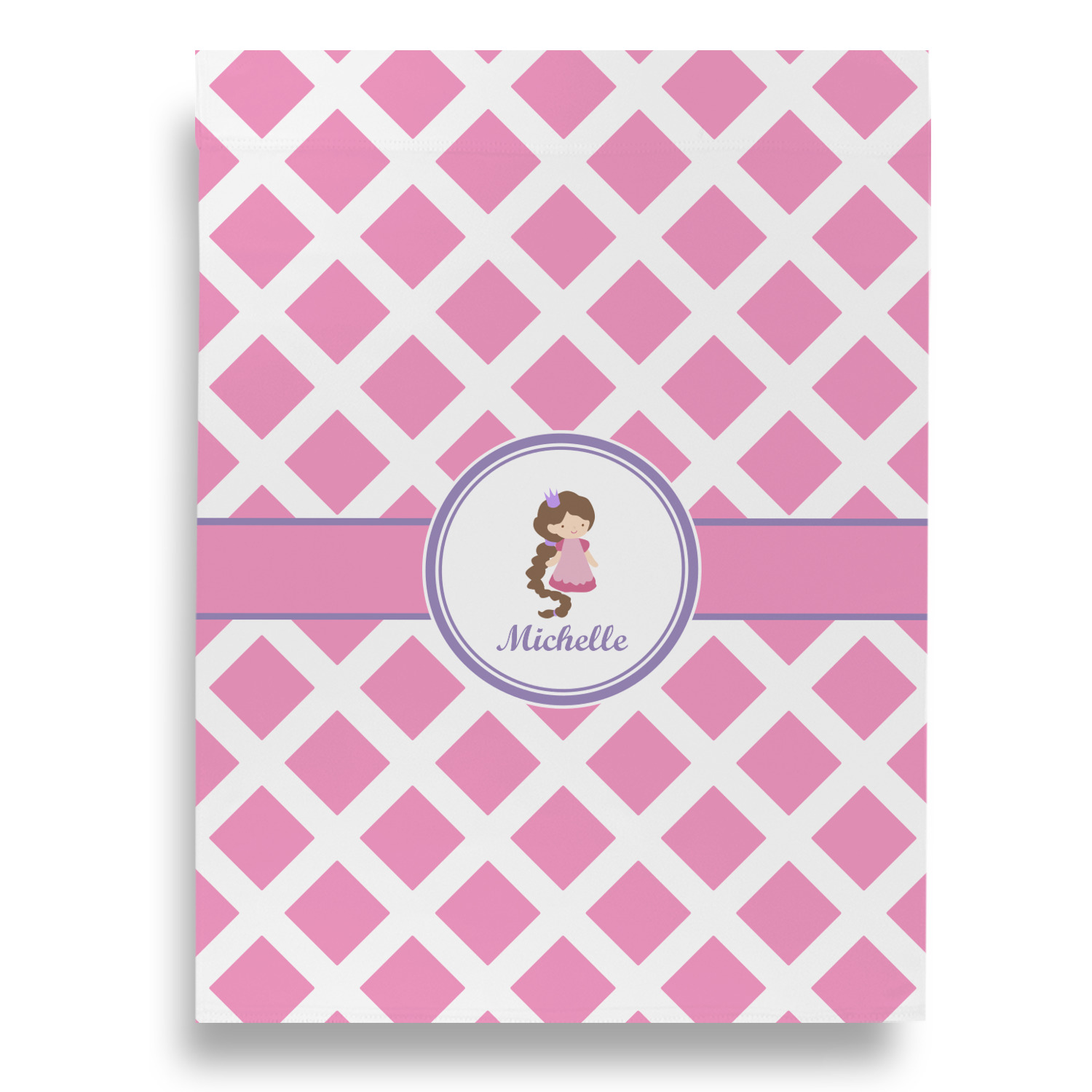 This princess themed print full of little girl pink and purple makes the statement that your little girl is The Princess. This print features every princess's dream full of castles, crowns, her very own prince frog to kiss, and lots of hearts fluttering about. The bottom of the design is a coordinating pink and white diamond pattern.
