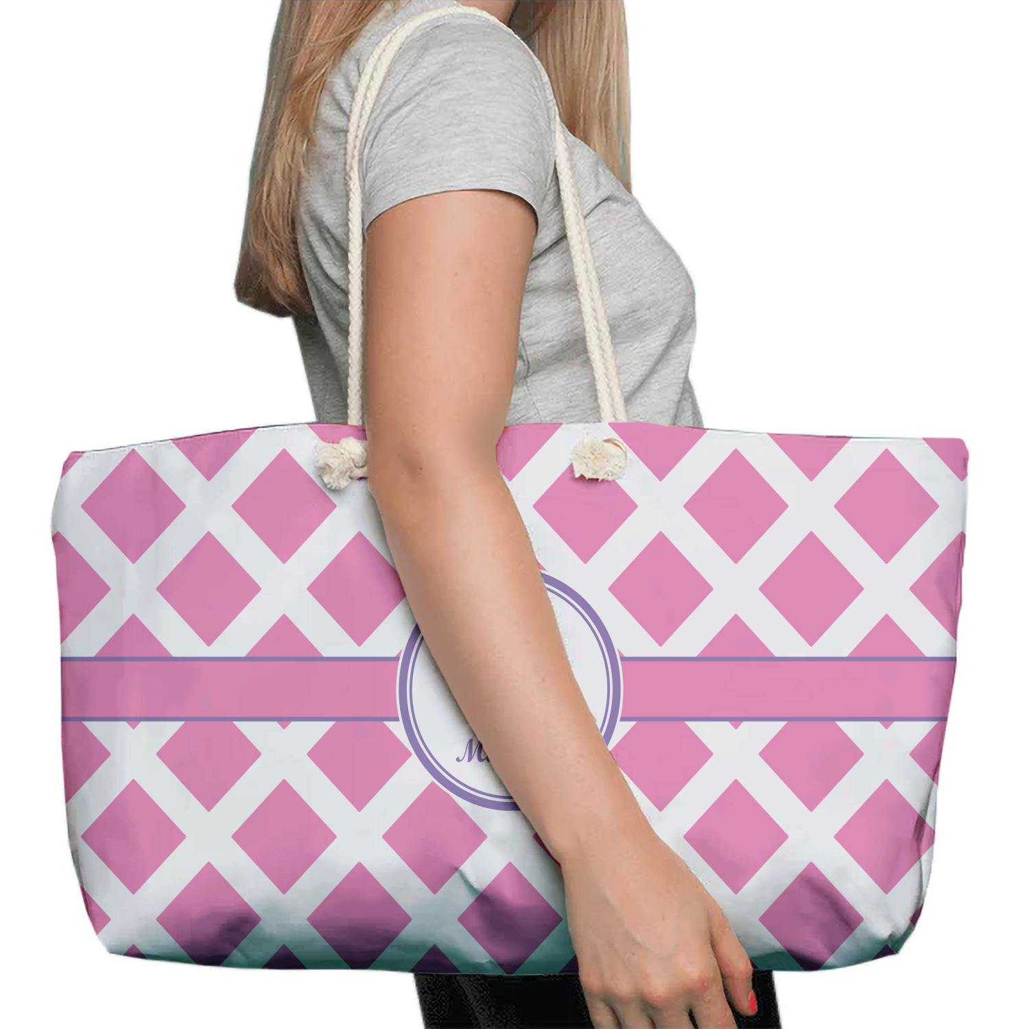 Our oversized weekender tote with rope handles is perfect for your weekend at the beach or on the town. This large tote are 24" W X 13" H, with a 5" gusset and a 27" thick rope handles with a knot that is put through a grommeted brass hole.