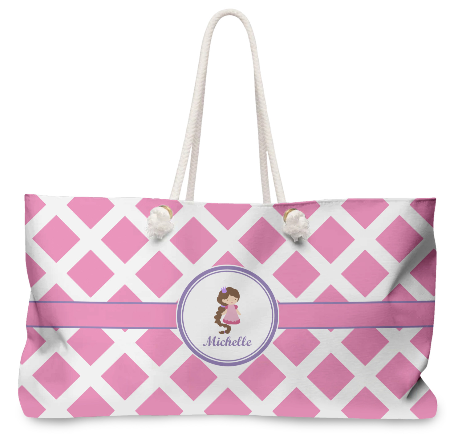 The center focal point of the design is a lovely pink band, trimmed in coordinating purple with a large label for personalization.