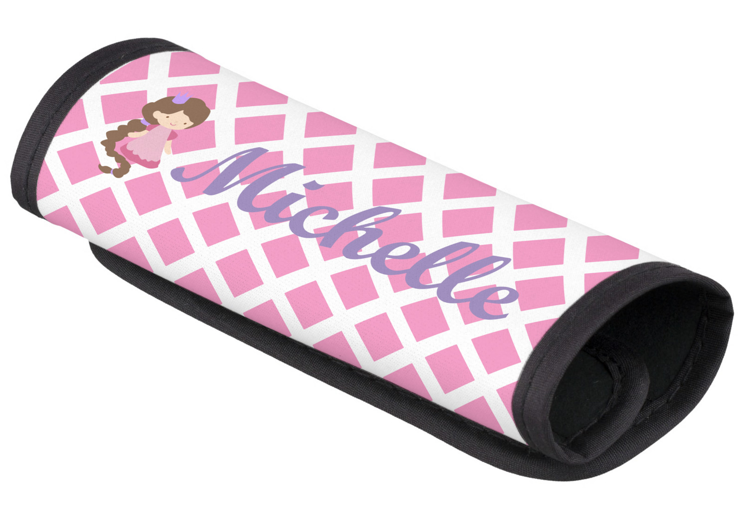 The center focal point of the design is a lovely pink band, trimmed in coordinating purple with a large label for personalization.