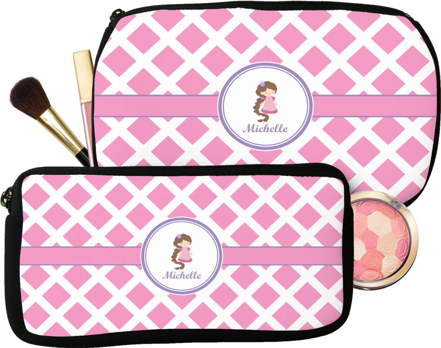 Our personalized makeup bags are available in many different designs, patterns and colors - so you are sure to find one that will love. They are made of neoprene (same material as wet-suits) and thus are water resistant, so spillages in your makeup bag will not end up all over you purse. They are customized on one side and are black on the other side and the zipper is black as well.
