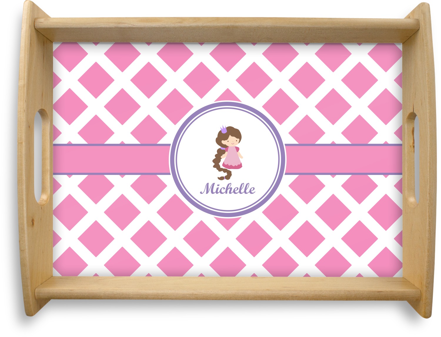 This serving tray with handles features square edges and two rounded sides, creating a very modern look. Each side is fabricated from a beautifully cut, natural wood. The bottom of the interior of the tray displays your customized design in bright, vibrant color. The tray is sold in both a black color and a natural wood look. Each variation of the wood serving tray has two sizes: Small, which is 14" x 10" x 2.25", and Large, which is 19.5" x 13.5" x 2.75".