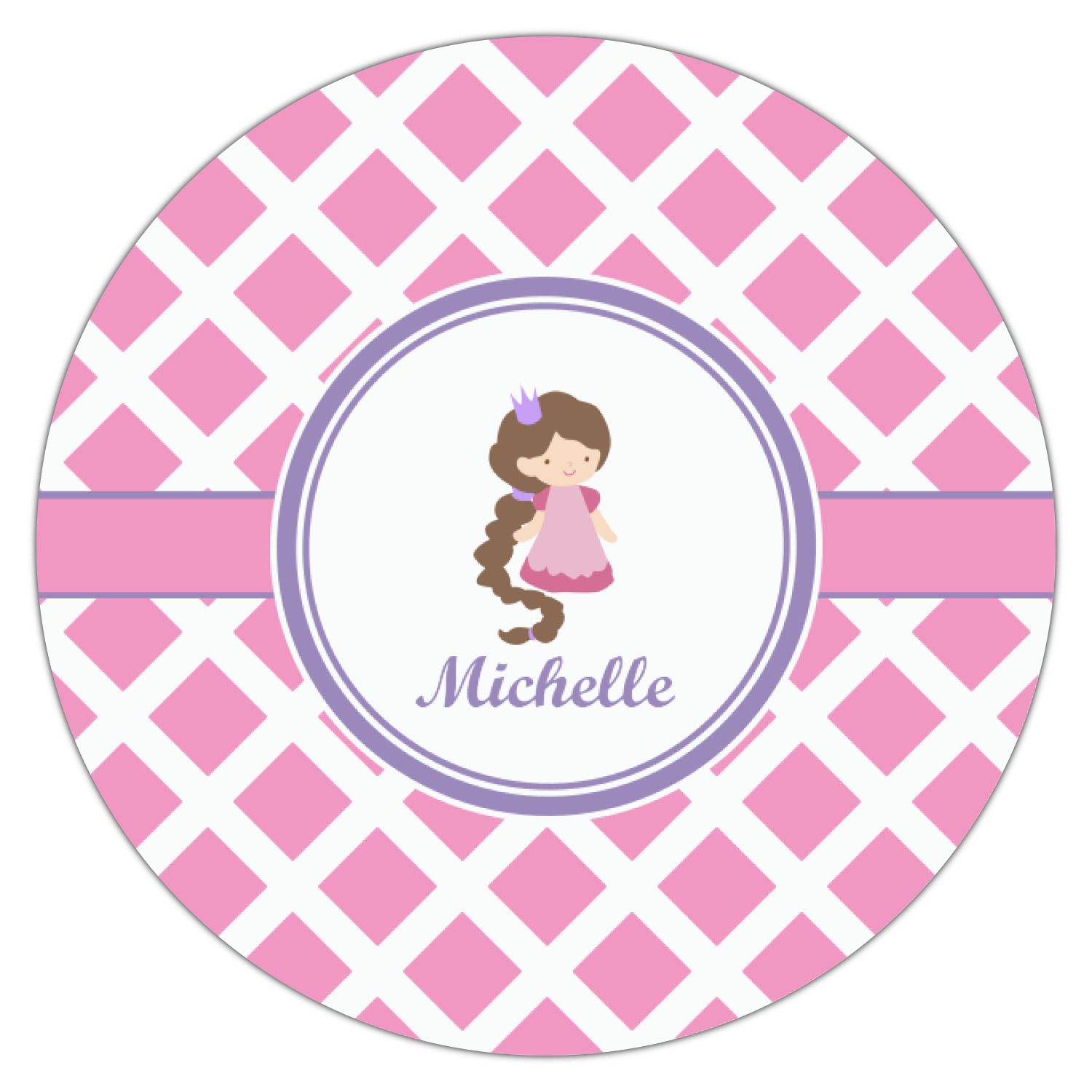 The center focal point of the design is a lovely pink band, trimmed in coordinating purple with a large label for personalization.