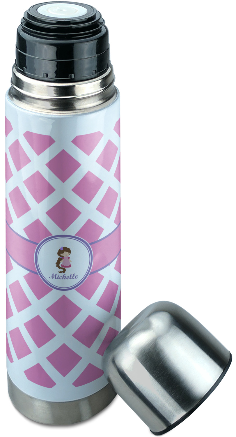 Manufactured from stainless steel, this thermos is built durably and double-walled insulated to preserve the temperature of your drink for hours. It also features a screw off lid that is made to also function as a small cup. Upon unscrewing this part of the thermos bottle, a pop-open, pour feature emerges. This feature allows you to slowly pour your beverage into your lid, ensuring a steady, controlled pour into your lid or other cup. With a capacity of 25 ounces, these large thermoses can hold several servings of your favorite beverage. Your customization is displayed all around the bottle with bright, vibrant color.