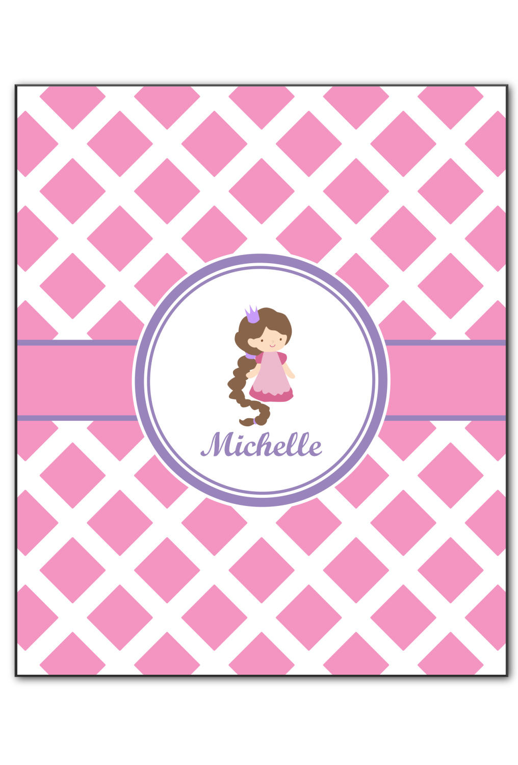 This princess themed print full of little girl pink and purple makes the statement that your little girl is The Princess. This print features every princess's dream full of castles, crowns, her very own prince frog to kiss, and lots of hearts fluttering about. The bottom of the design is a coordinating pink and white diamond pattern.