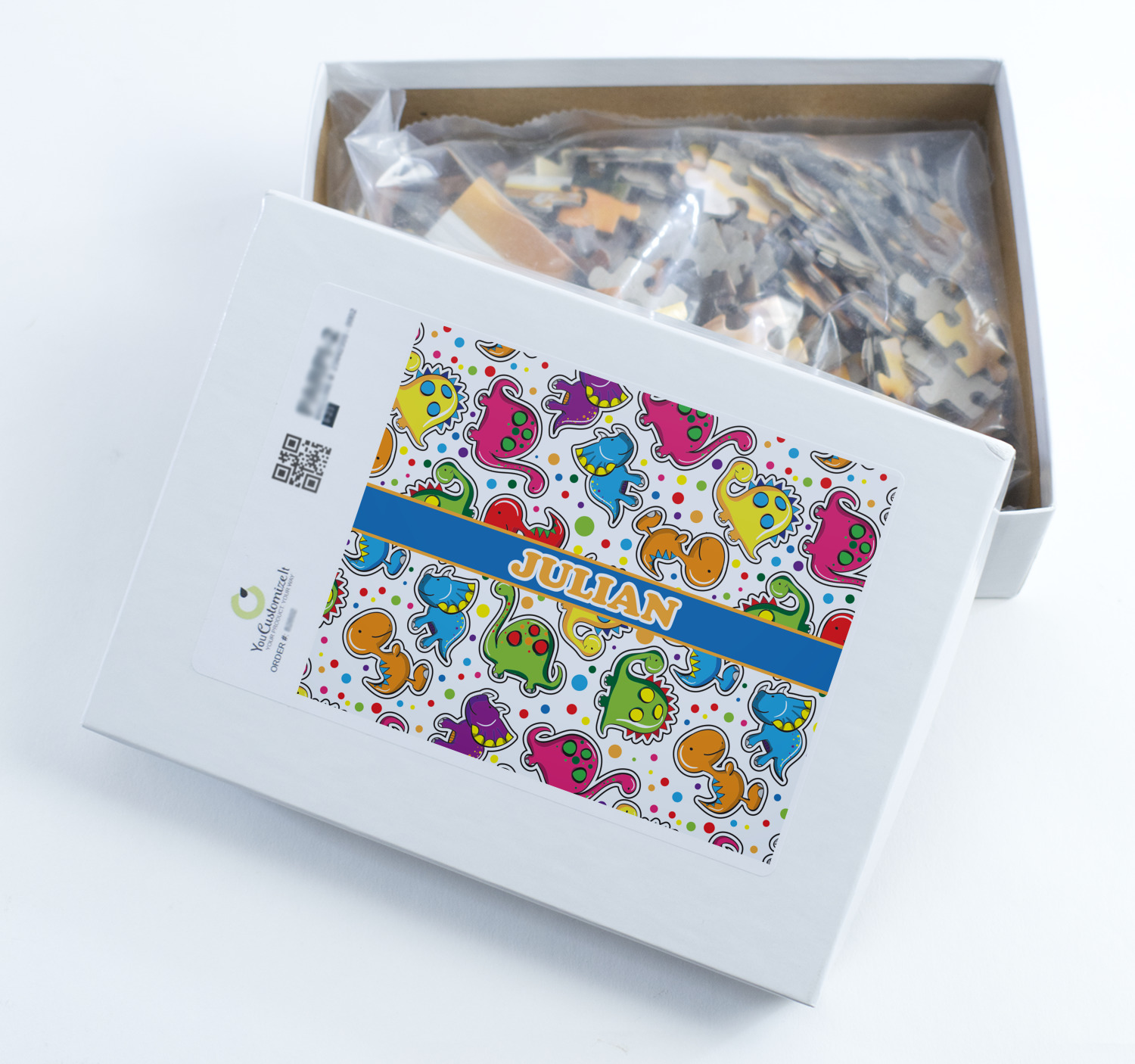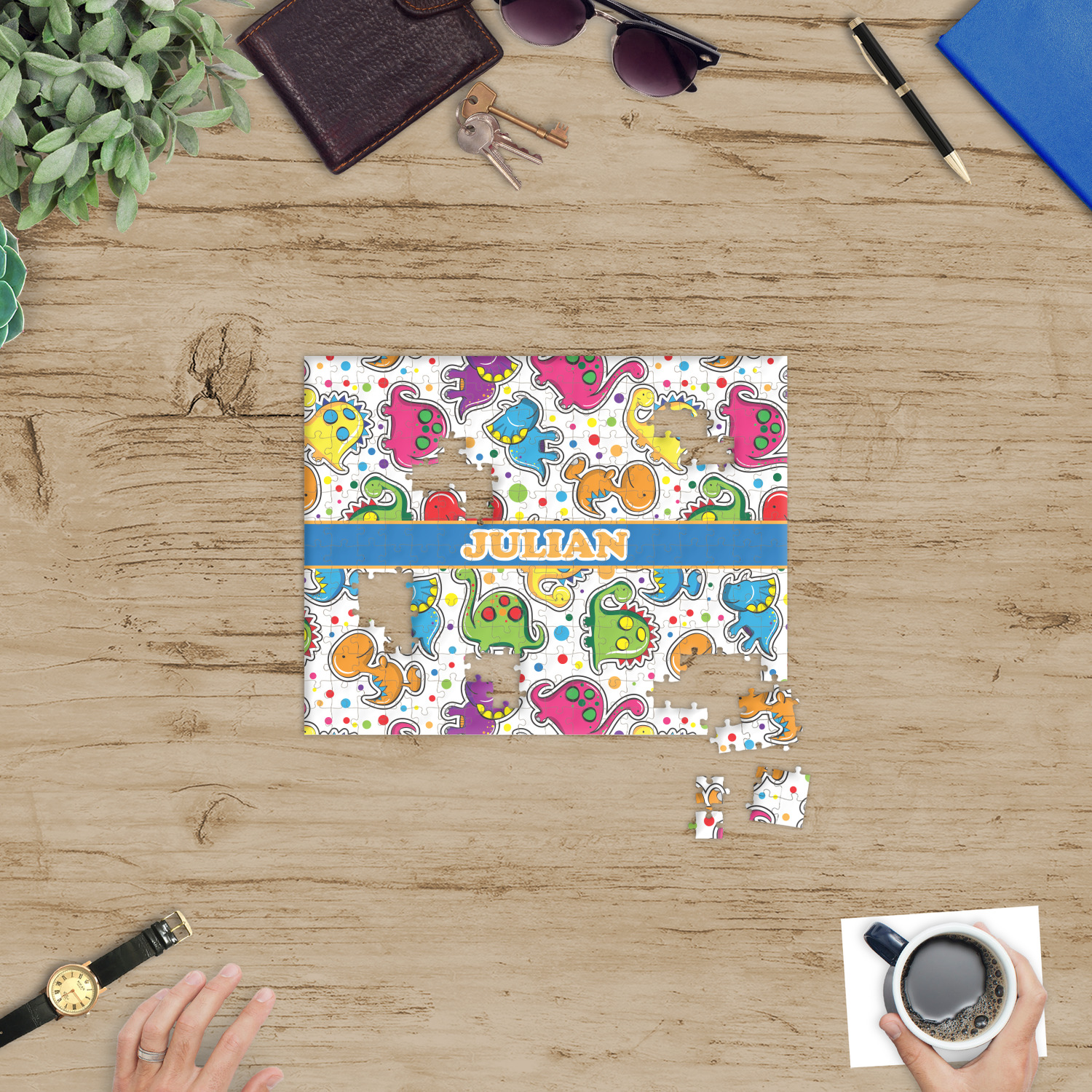 You can also upload your logo or art that you or your kids drew. To create more challenging jigsaw puzzles, you can create a pattern from with your logo or artwork. You can also add other elements such as text or personalization.