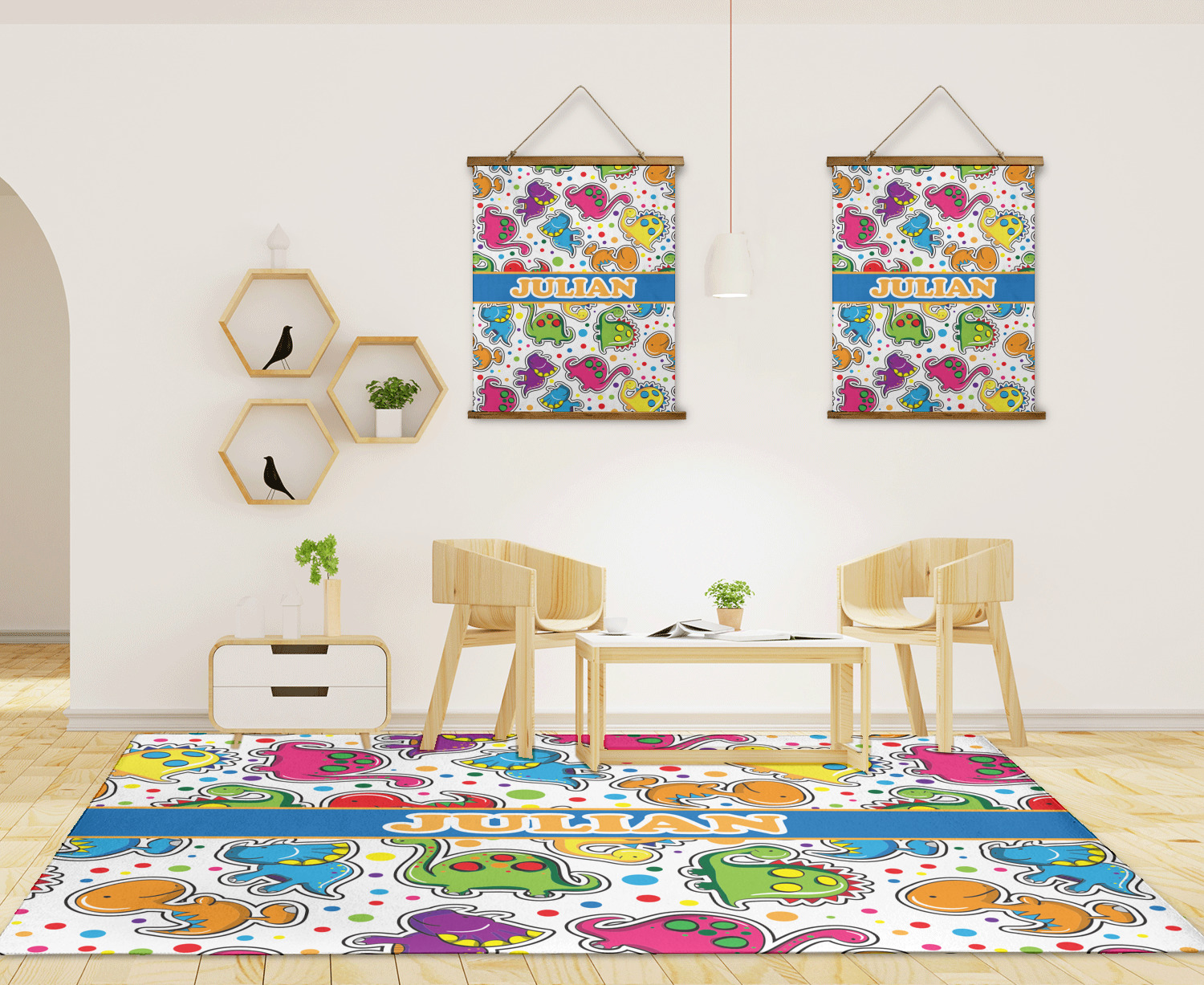 Colorful dinosaurs spring to life in this whimsical and comical versatile pattern. Set on a backdrop of multicolored polka dots these dinosaurs are sure to delight your little ones. Using bright colors of Blue, red, green, purple, yellow, and pink these dinosaurs are sure to stir up your little one's imagination in no time.