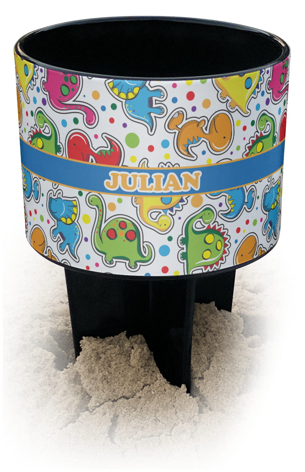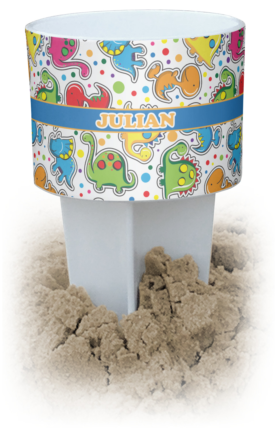 This cup holder has a large stake at its bottom that anchors it to the sand or ground below, while the cup holder rests above the stake. The entire drink holder is made of durable plastic and displays your customization around the cup holder portion. We sell these personalized beach spikers in two different colors: black and white.
